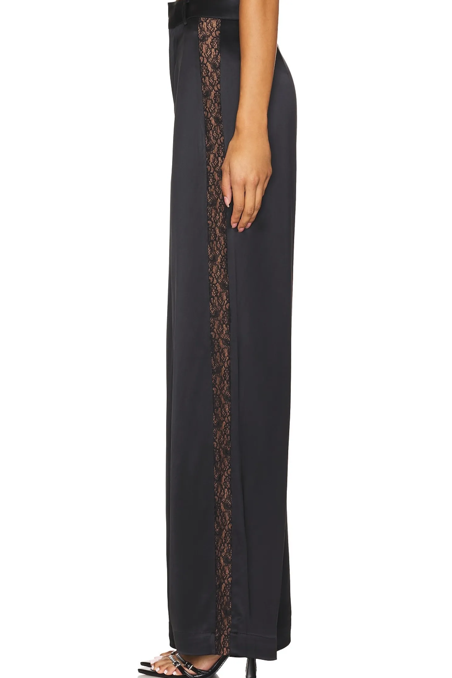 Self: 73% acetate 27% polyester Trim 1: 100% polyamide Trim 2: 100% nylon.Made in China.Dry clean only.Zip fly with hook and bar closure.Lace detail along sides.Midweight satin fabric.Item not sold as set.23" at the knee and 23" at the leg opening