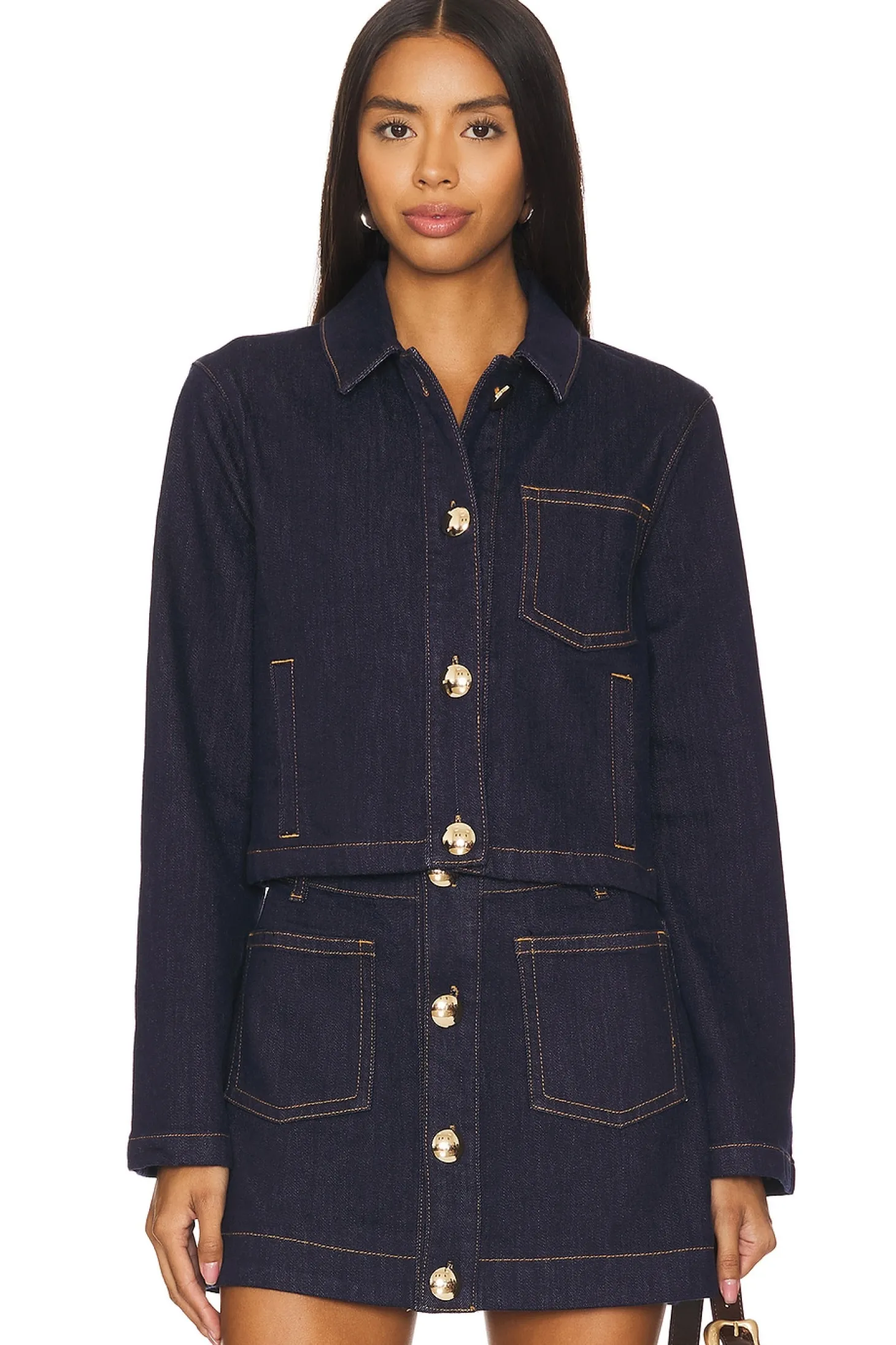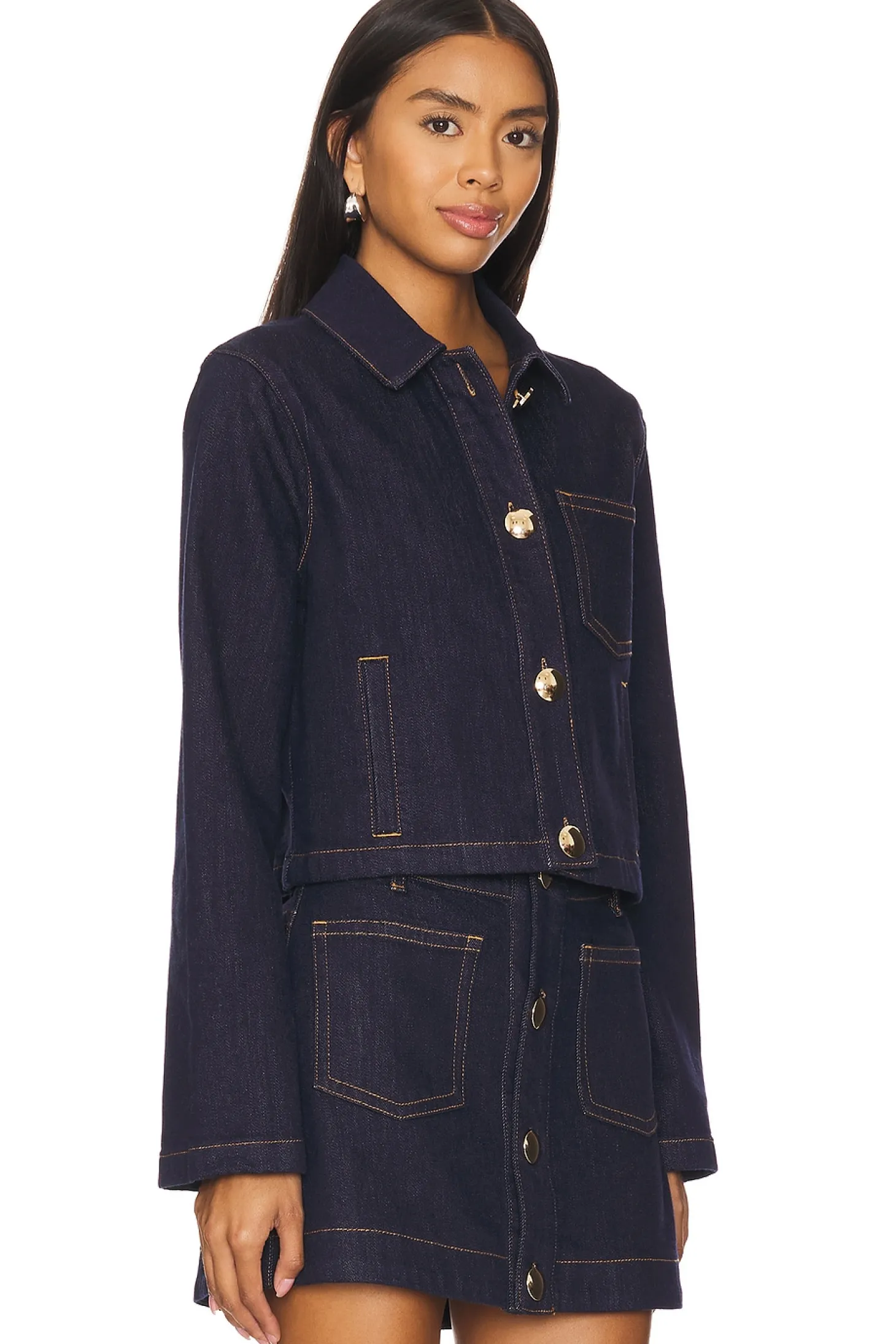 94% cotton 5% polyester 1% elastane.Made in China.Machine wash.Front button closure.Side pockets and single breast pocket.Item not sold as set