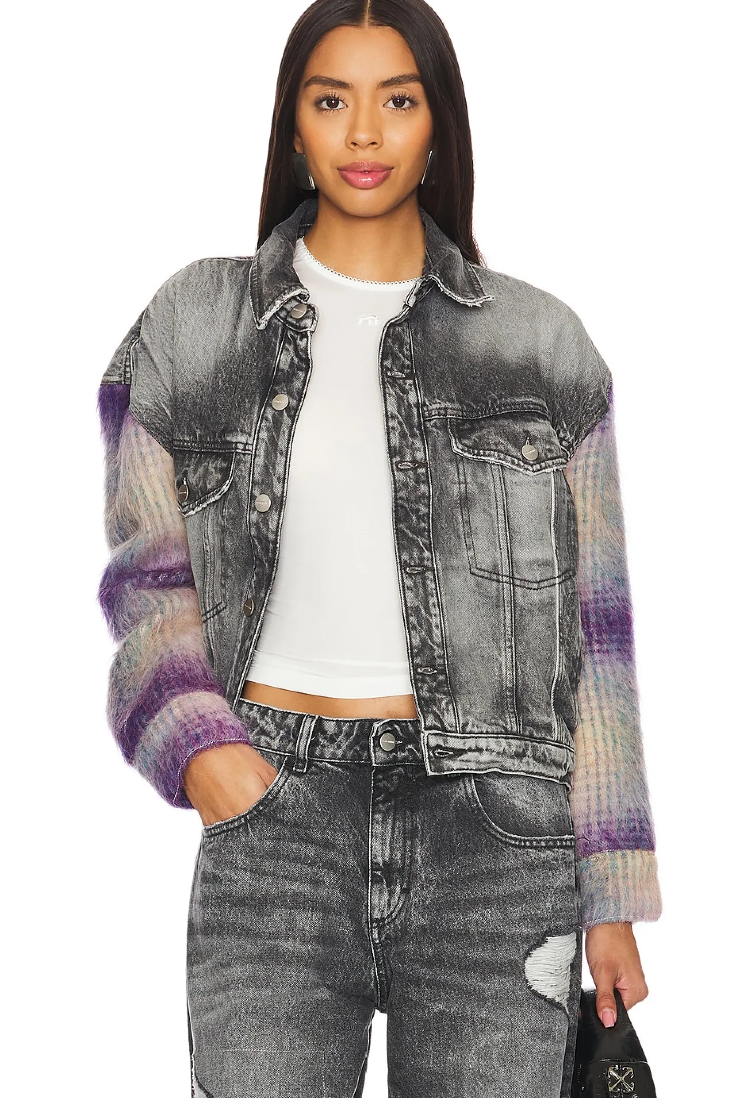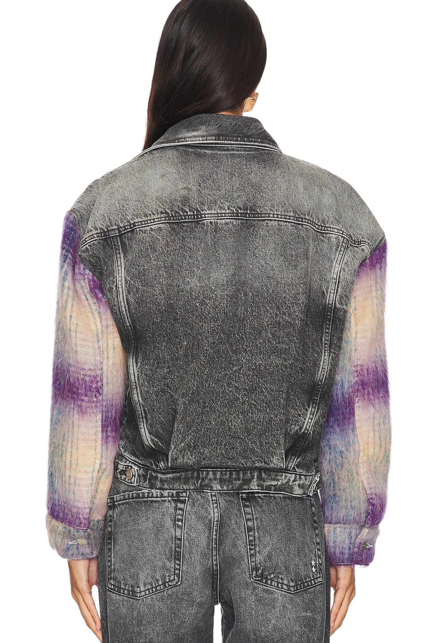 Self: 100% cotton Contrast Fabric: 47% wool 27% polyester 20% alpaca 6% nylon.Made in Tunisia.Dry clean only.Front button closure.4-pocket design.Buttoned cuffs.Midweight denim with contrast fuzzy knit sleeves