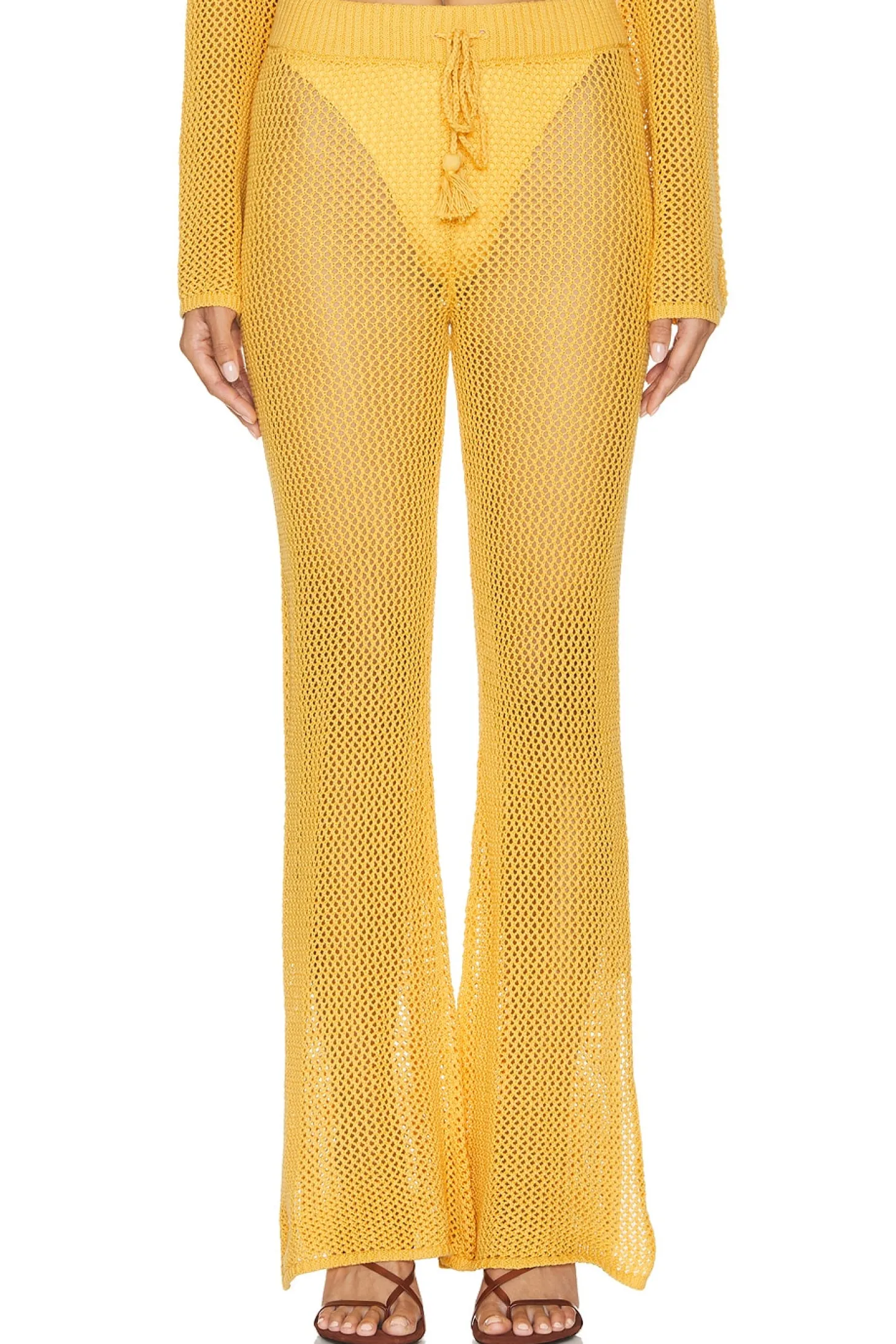 100% cotton.Made in China.Hand wash recommended.Drawstring closure.Lightweight open knit fabric.Item not sold as a set.14" at the knee breaks to 20" at the leg opening