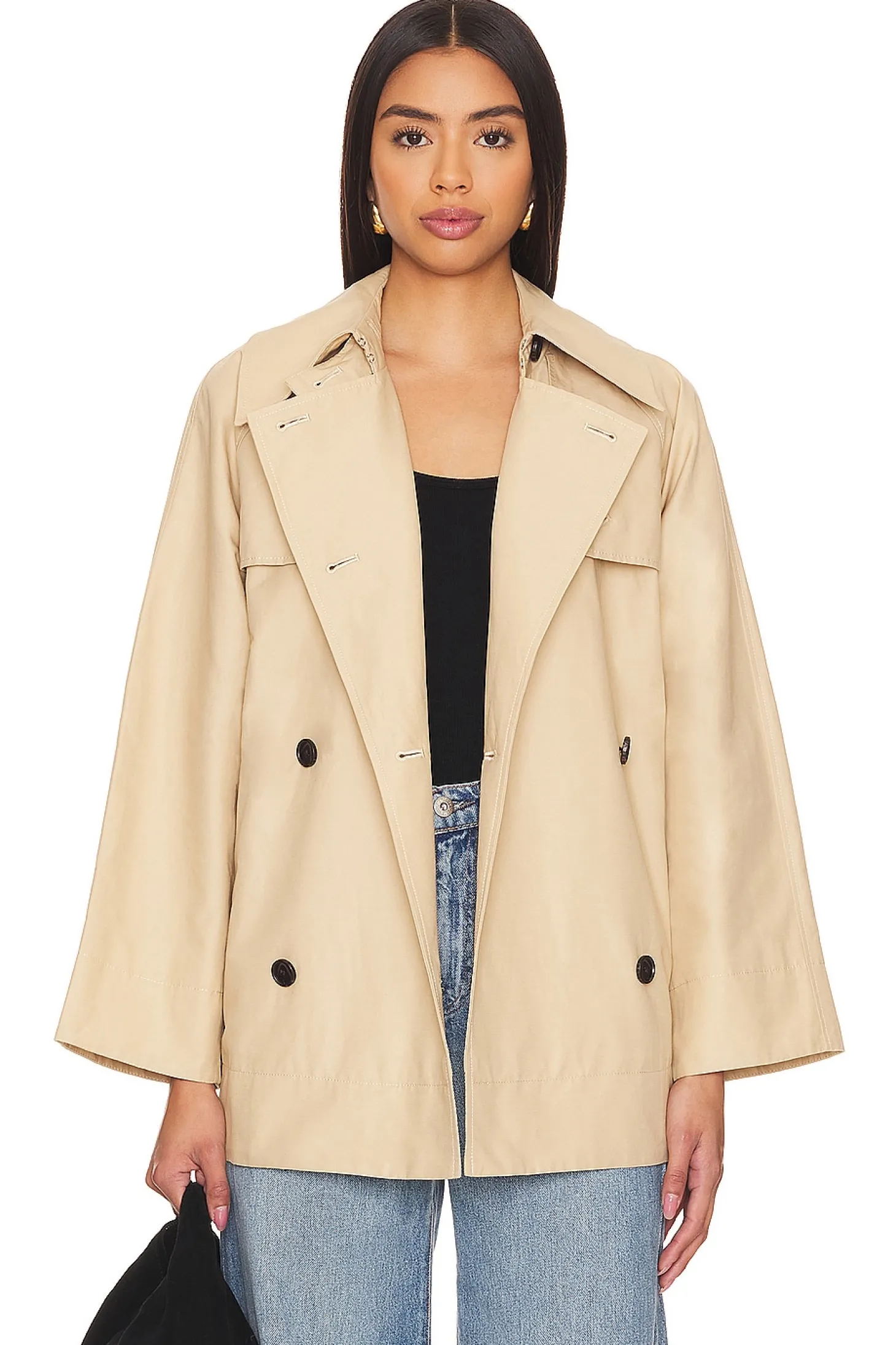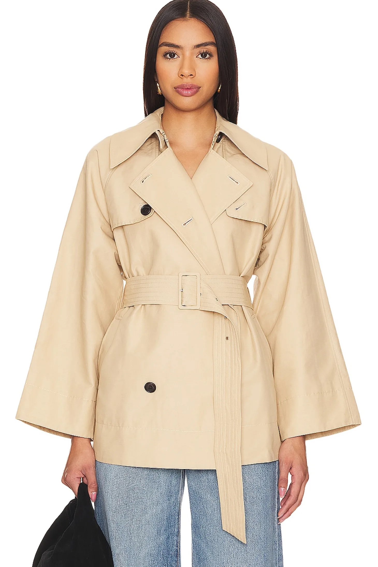 Self: 73% cotton 27% linen Lining: 100% cotton.Made in China.Hand wash.Front button closure.Attached waist belt.Side flap pockets.Midweight twill fabric