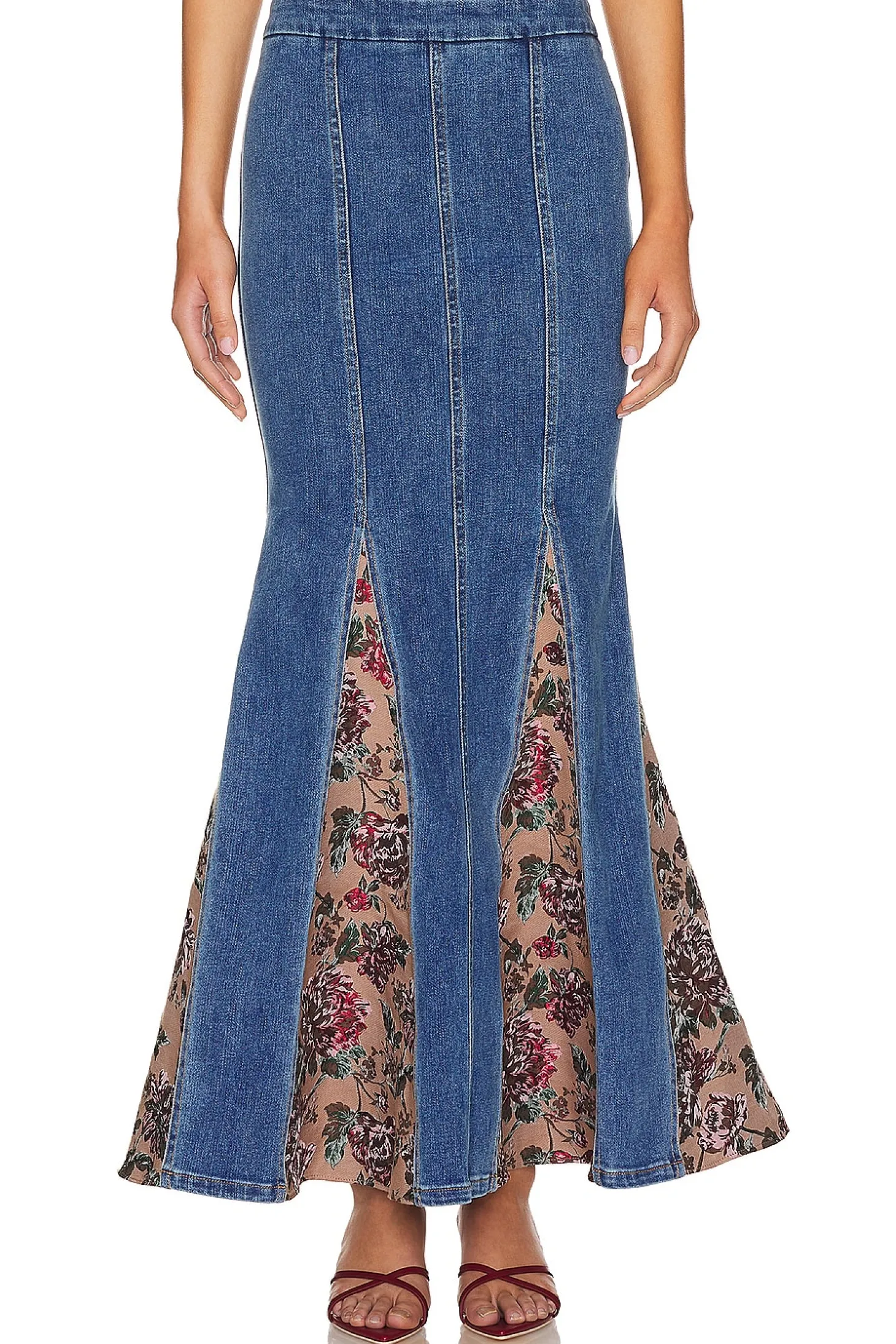 Introducing the MAJORELLE Luda Maxi Skirt in a serene Washed Blue hue. Crafted from a blend of denim and jacquard fabric, this skirt exudes boho elegance. Paired with its matching top, it creates a cohesive and stylish ensemble that's perfect for a laid-back brunch or casual daytime gatherings. Embrace the free-spirited vibe with this effortlessly chic maxi skirt..Self: 92% cotton 6% polyester 2% elastane Contrast Fabric: 70% polyester 30% metallic.Made in China.Dry clean only.Unlined.Hidden side zipper closure.Midweight denim and jacquard fabric Item not sold as a set.Skirt measures approx 38" in length