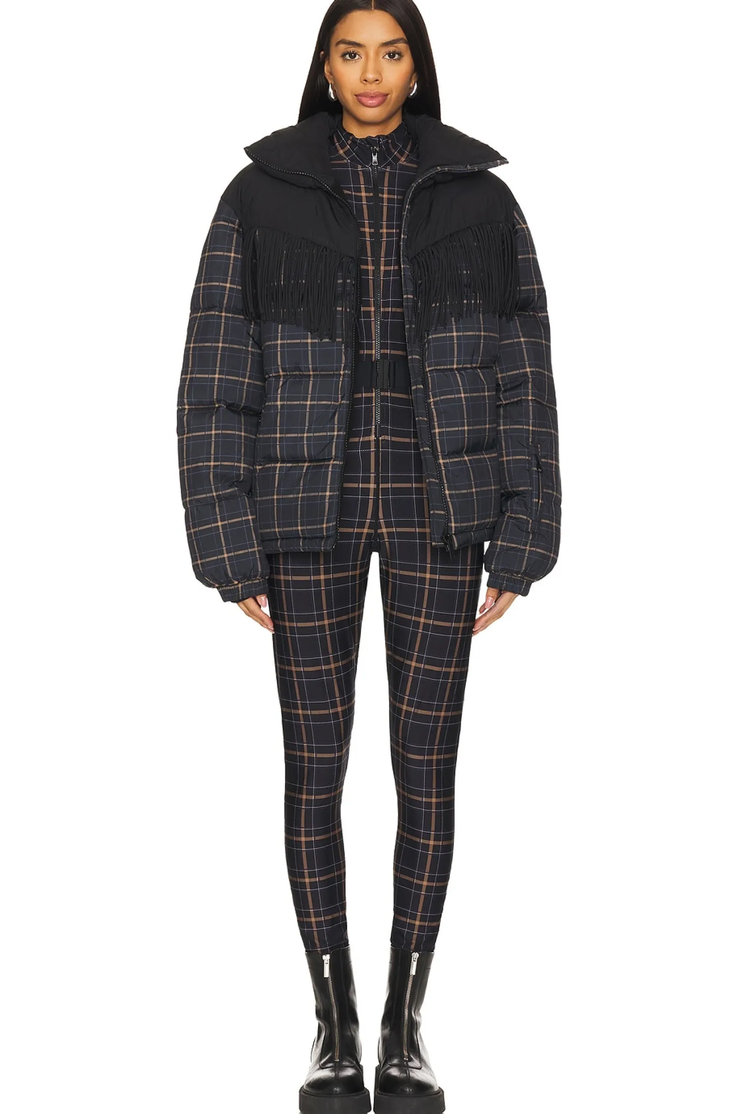 100% polyester.Made in China.Machine wash.Exposed front zipper closure with optional waist belt.Side zip pockets.Zip sleeve pockets.Padded ripstop fabric with fringe accent and pull-cord waistline.Item not sold as set