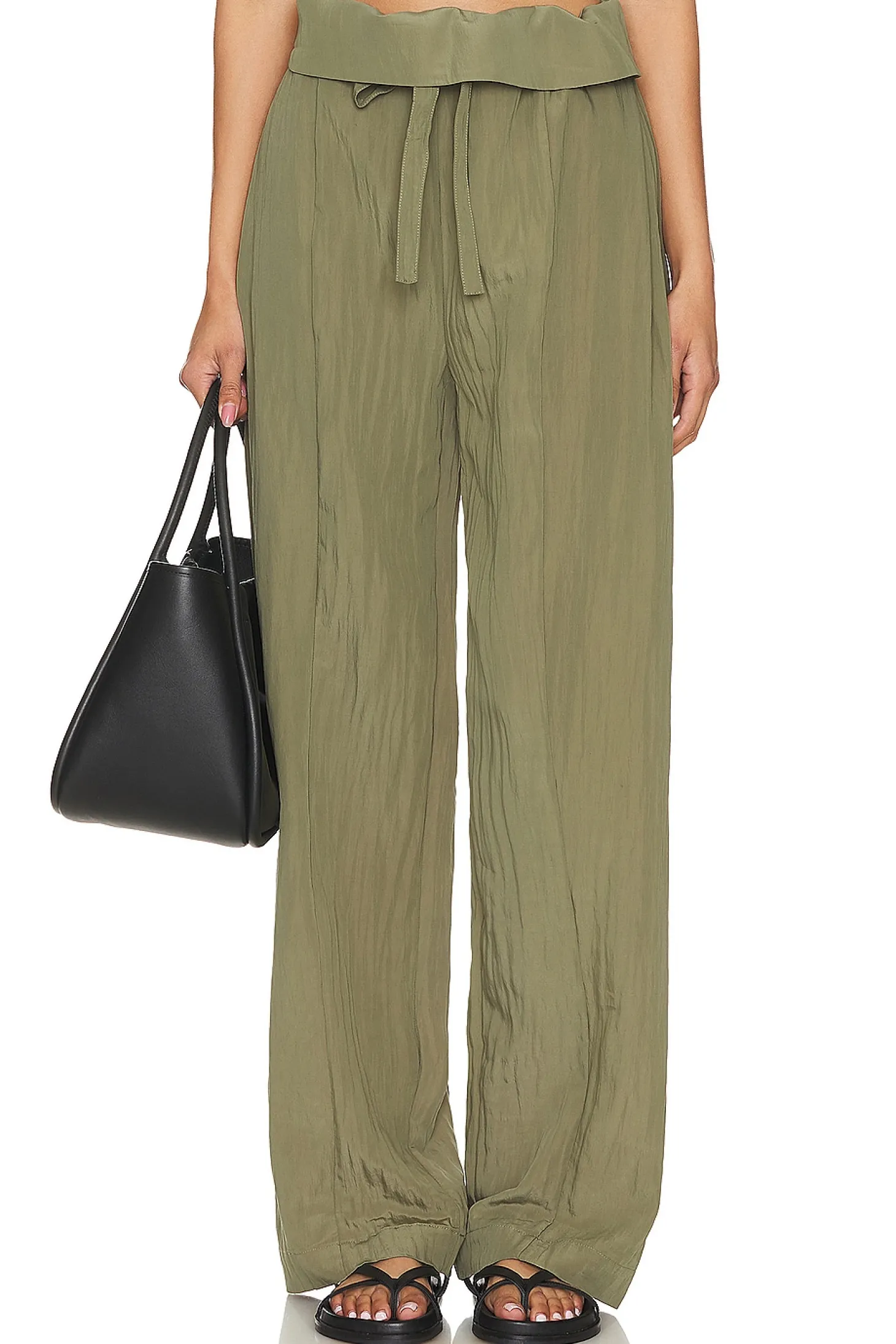 85% rayon 15% nylon.Made in China.Hand wash.Drawstring waist tie closure with foldover waist.Side slant pockets.Stonewash satin fabric.23" at the knee narrows to 20" at the leg opening Size XS waist circumference measures approx 12"-34"