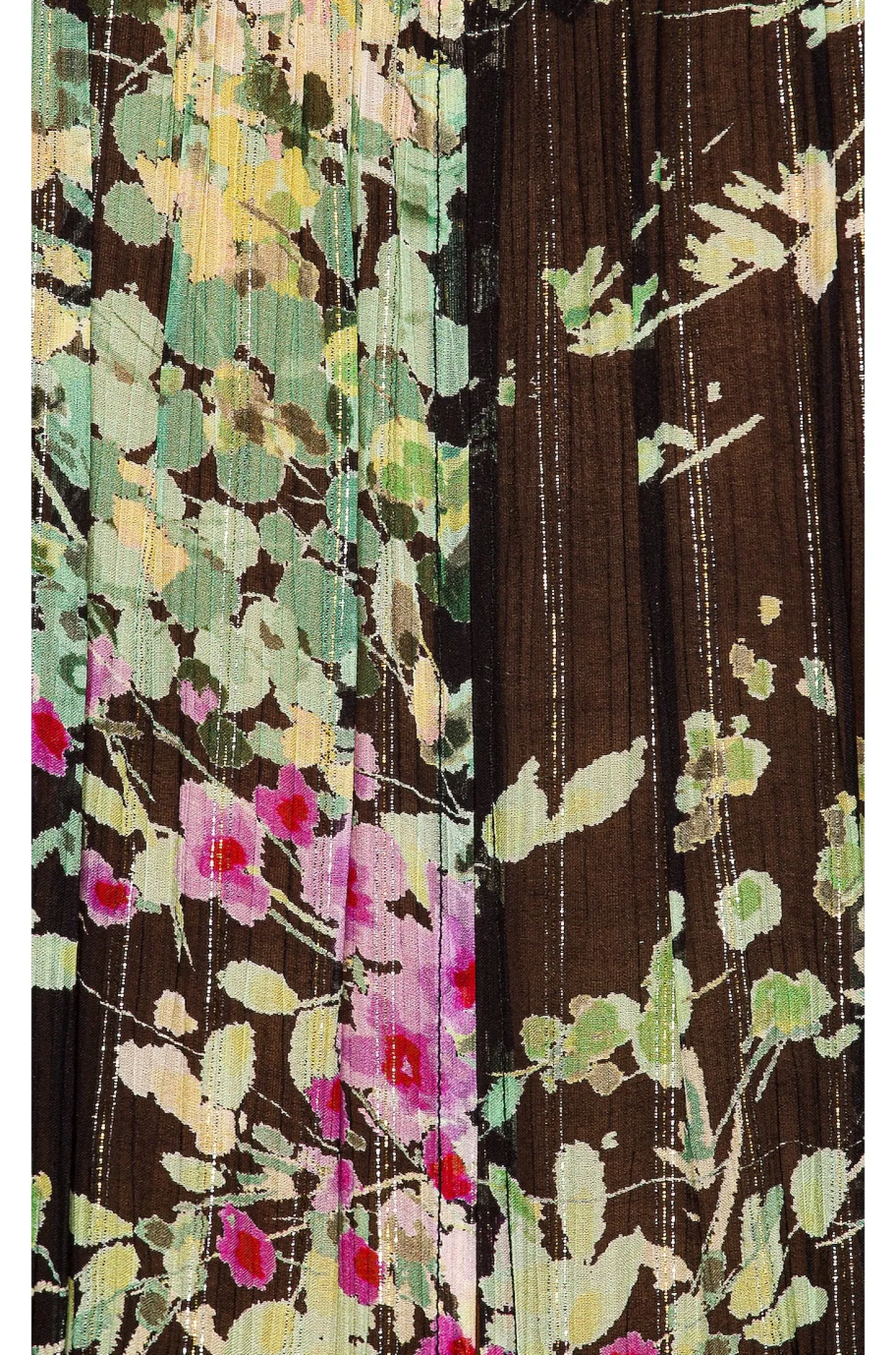 Poly blend.Imported.Hand wash.Partially lined.Partial front loop button closure and hidden back zipper closure.Neck tie detail.Shoulder padding Lightweight chiffon fabric with lurex threading