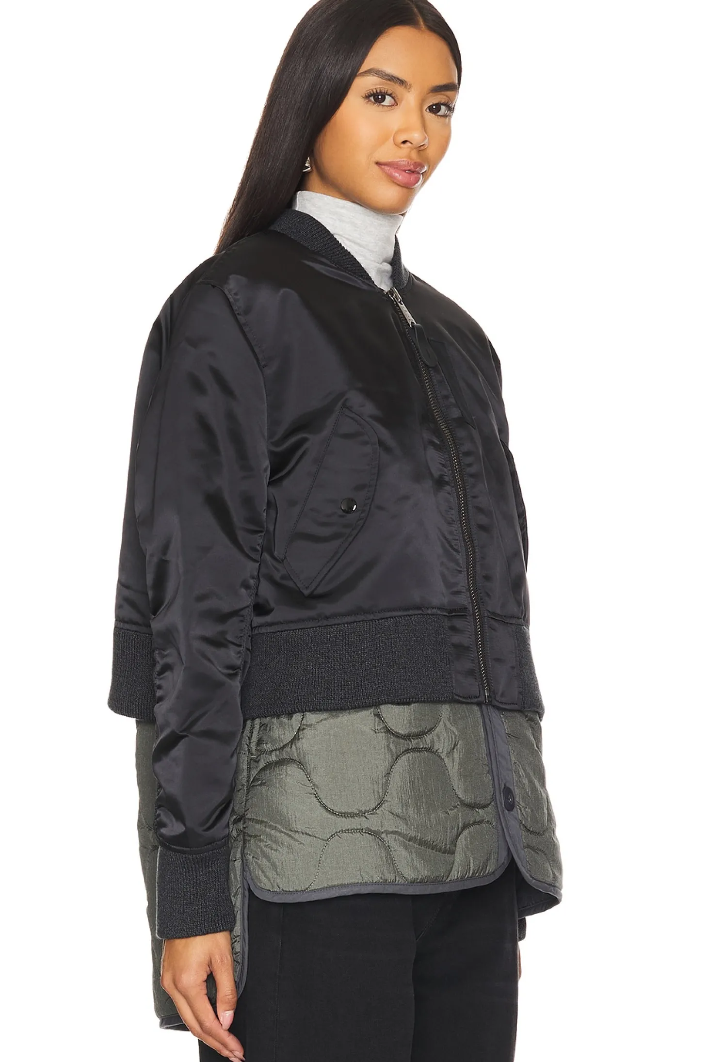 Self: 100% nylon Self 2: 65% cotton 35% nylon Lining: 100% nylon Filling: 100% polyester.Made in China.Machine wash.Exposed front zipper closure Vest front button closure.Flap pockets with snap button closure Cargo pocket at sleeve.Detachable vest with button closure at shoulders.Ribbed cuffs, hem and neckline.Padded ripstop fabric