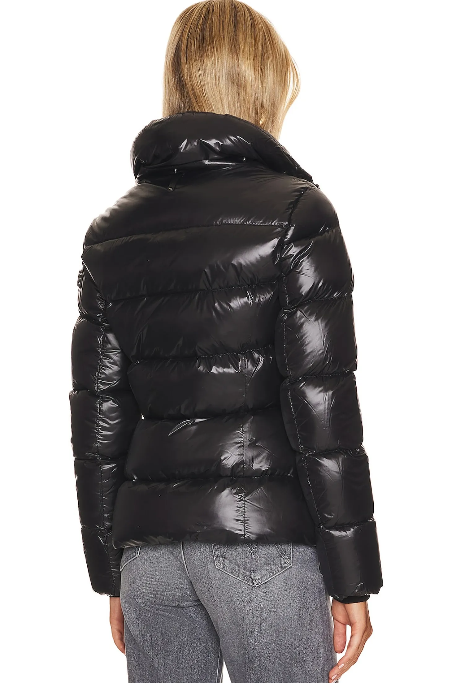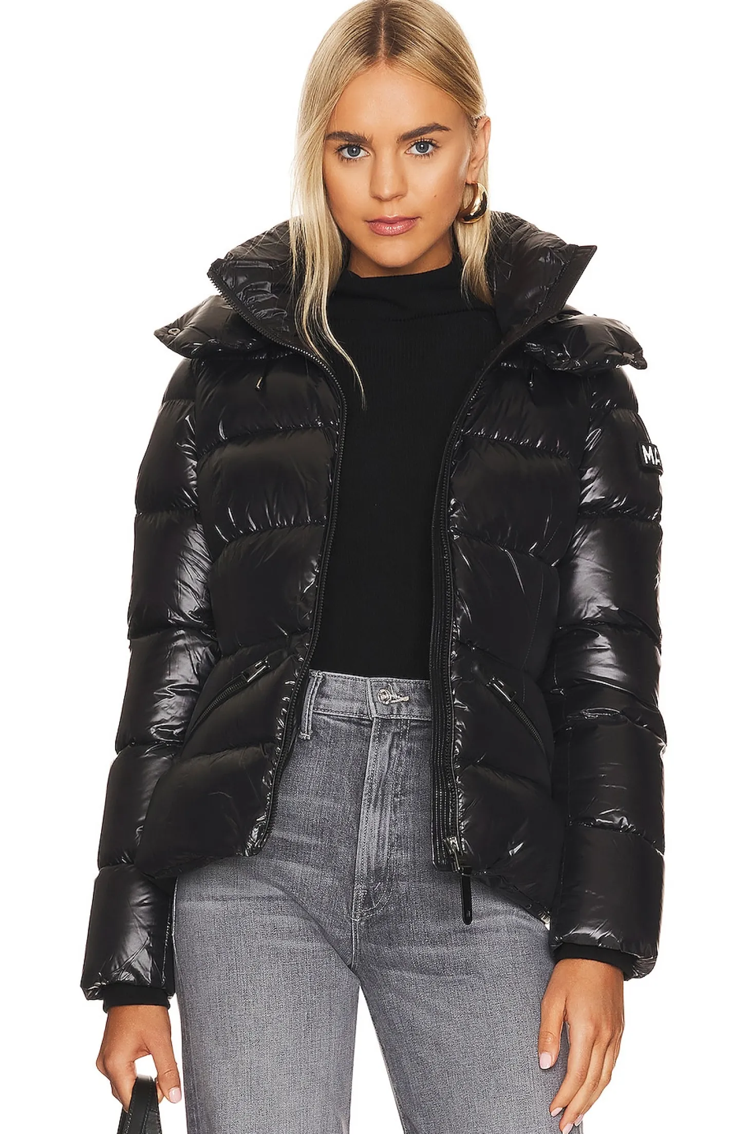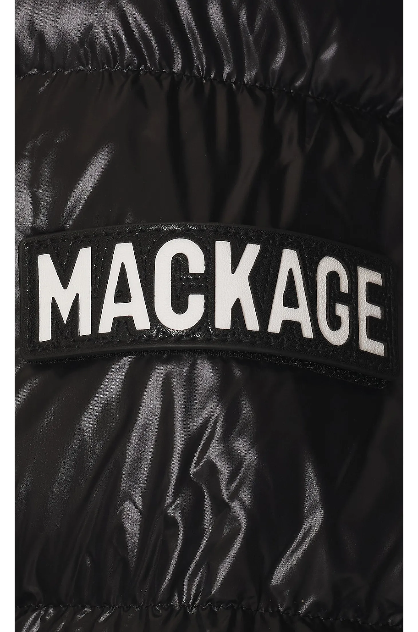 Self & Lining: 100% nylon Trim: 100% polyurethane Filling: 90% duck down 10% feathers Knit: 45% wool 45% acrylic 10% spandex.Made in Vietnam.Machine wash.Front zipper closure.Detachable hood.Side slant zipper pockets.Rubberized velcro logo patch at shoulder.Plush faux leather fabric