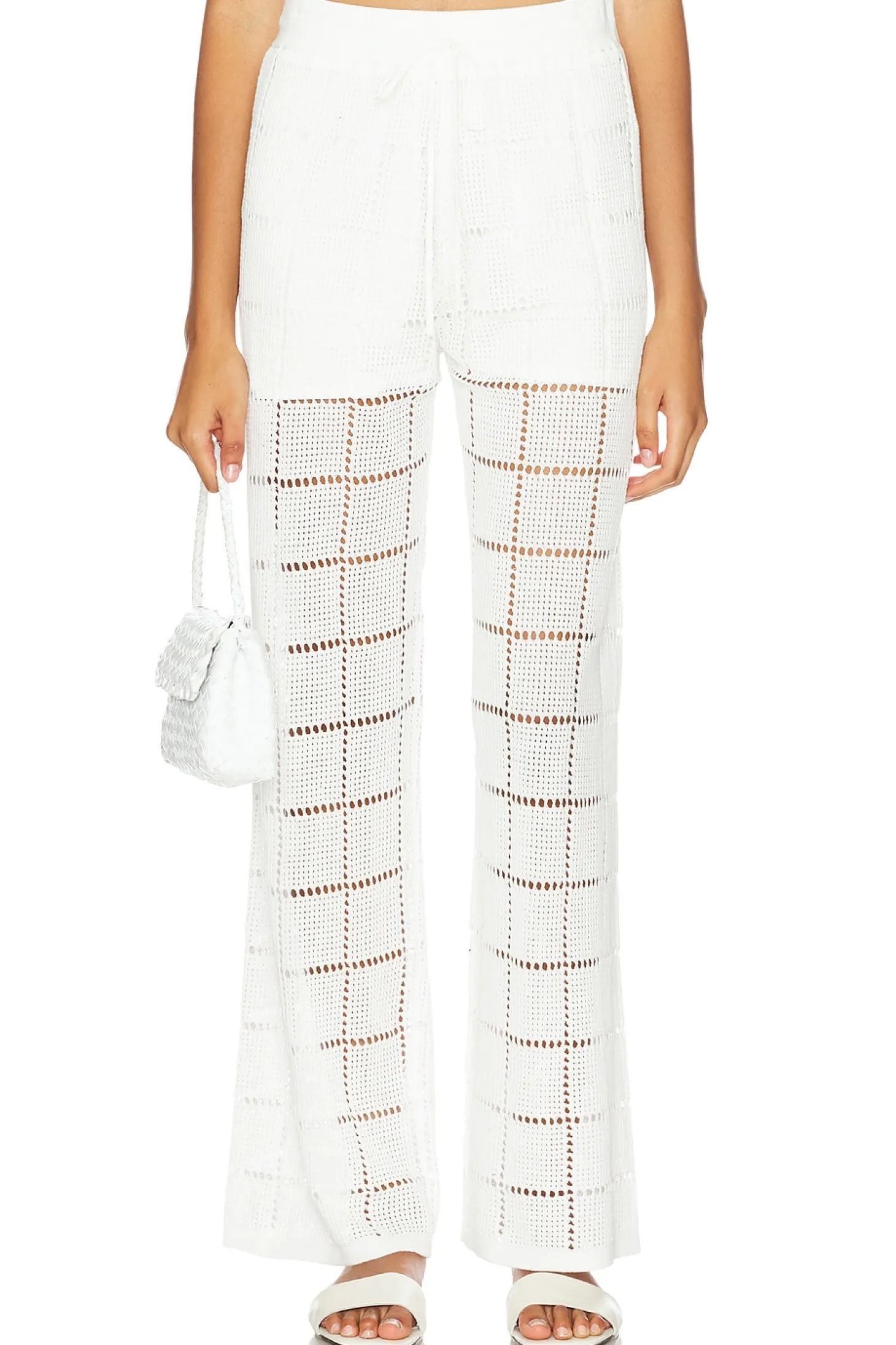 Self: 100% mercerized cotton Lining: 95% rayon 5% elastane.Made in China.Hand wash.Elastic drawstring waist tie closure.Shorts lining.Open crochet knit fabric.Item not sold as set.23" at the knee and 23" at the leg opening