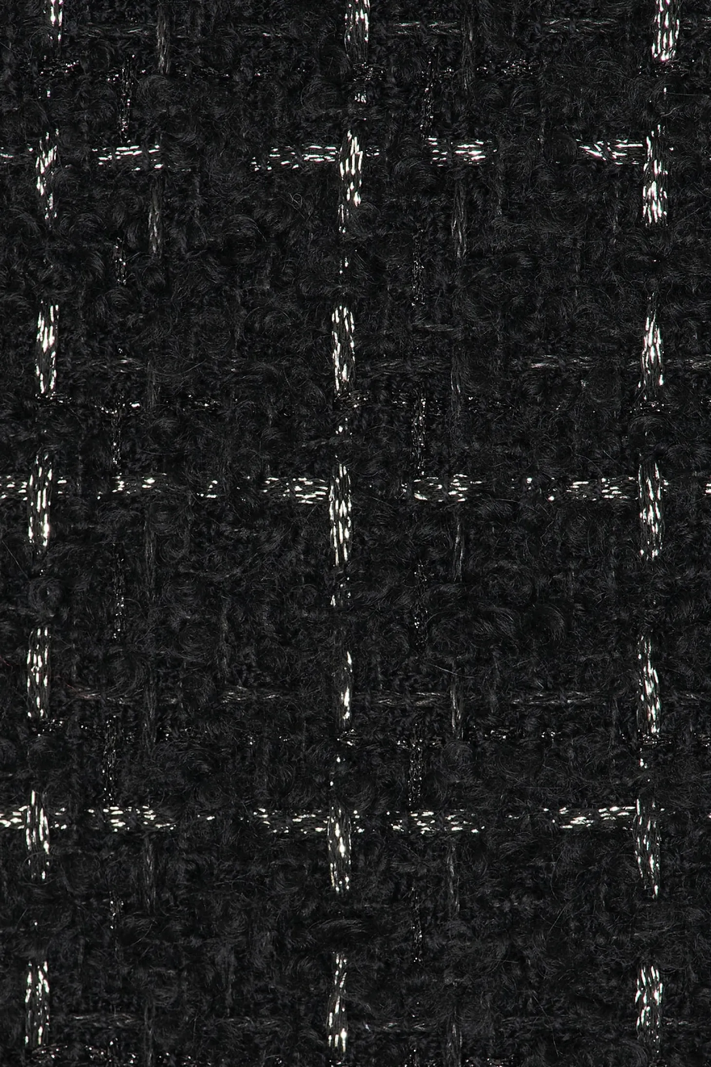 Self: 46% wool 20% viscose 10% acrylic 10% polyester 8% cotton 3% polyamide 3% metallized fiber Lining: 52% viscose 48% cotton.Made in Romania.Dry clean only.Open front.4-pocket design.Lightly padded shoulders.Lightweight tweed fabric