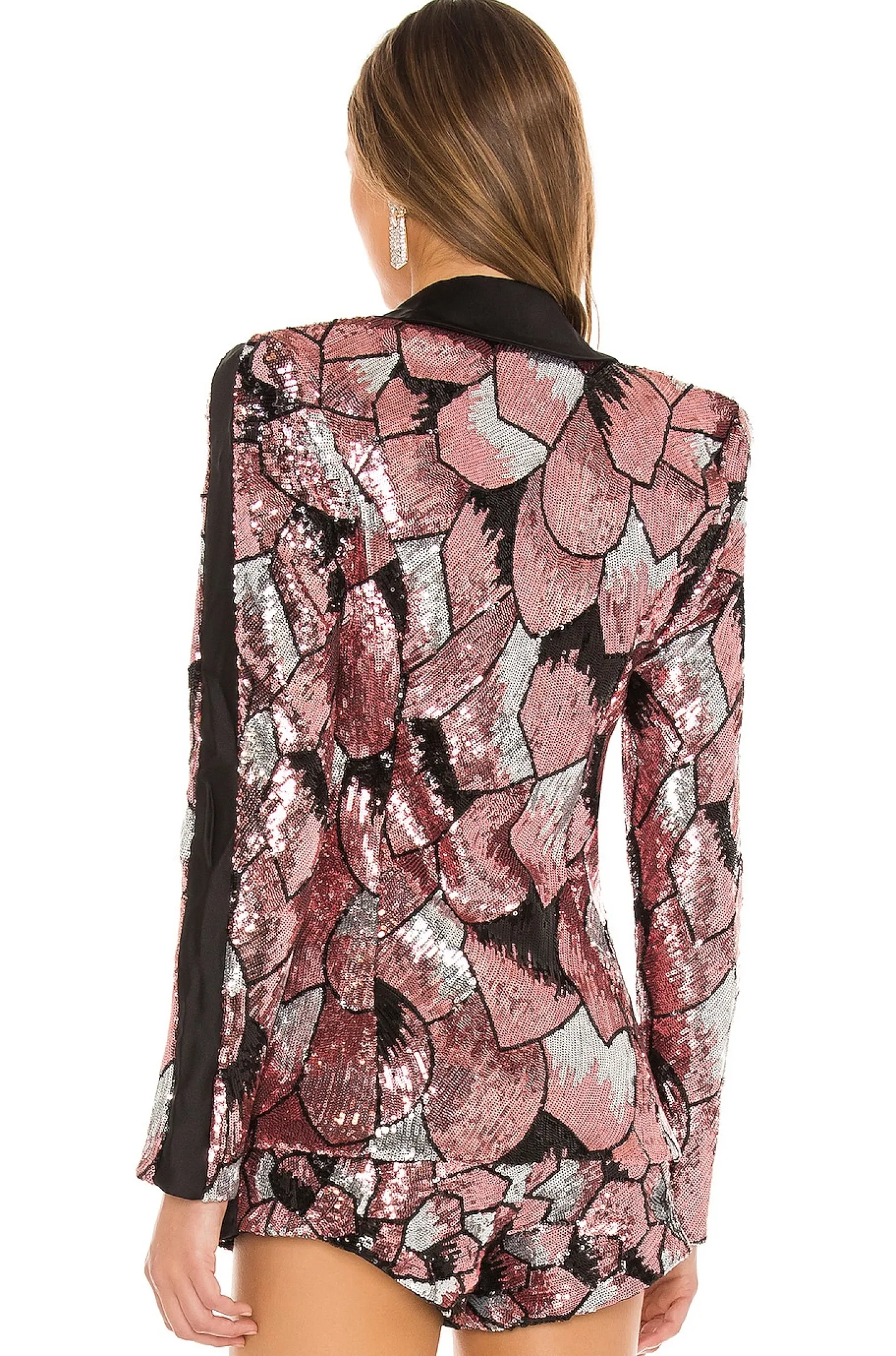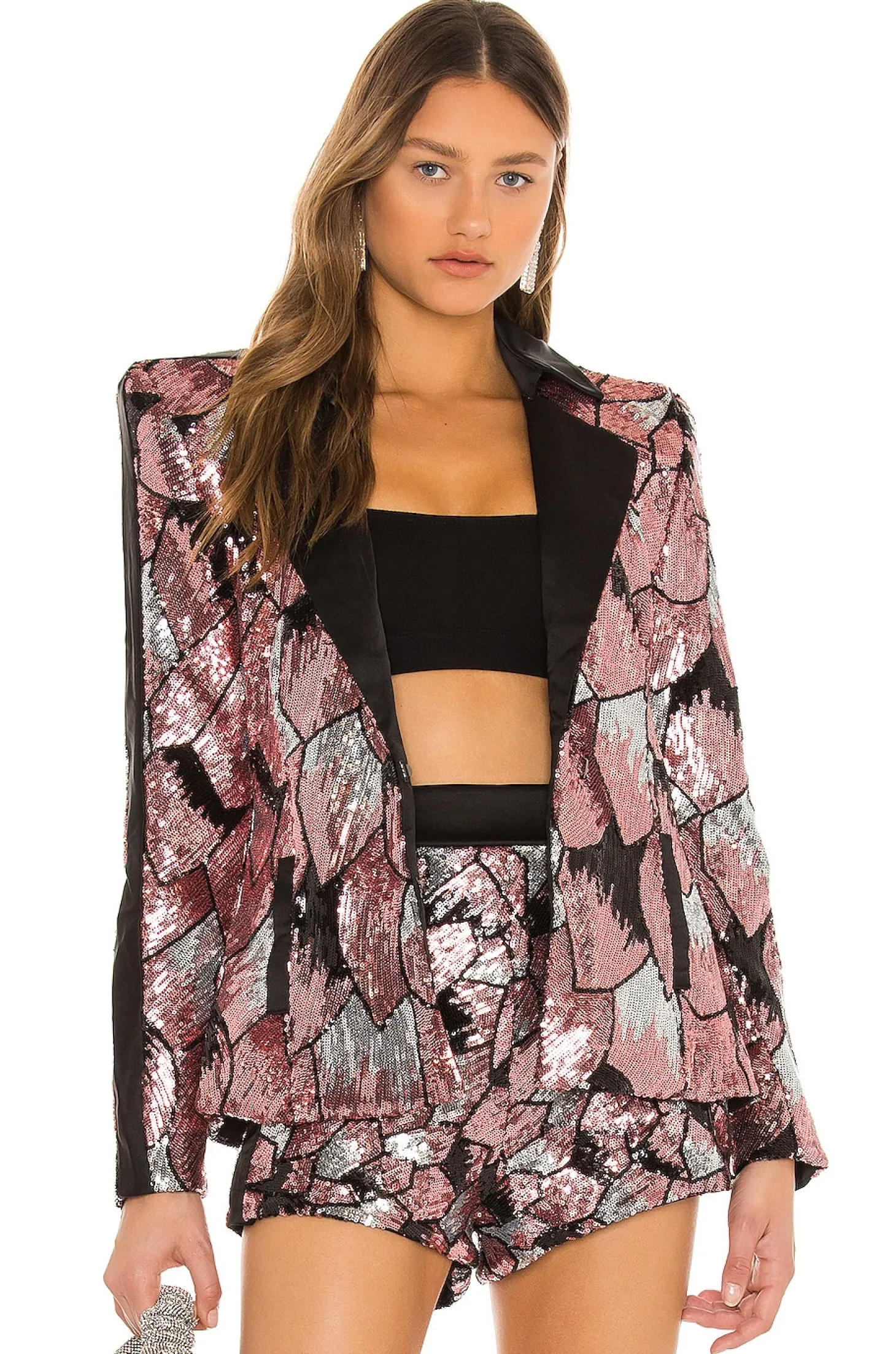 Self: 100% poly Lining & Contrast Fabric: 95% poly 5% elastane.Made in China.Hand wash.Front dual hook and bar closure.Padded shoulders.Side satin panels.Sequin embellishments throughout.Item not sold as a set