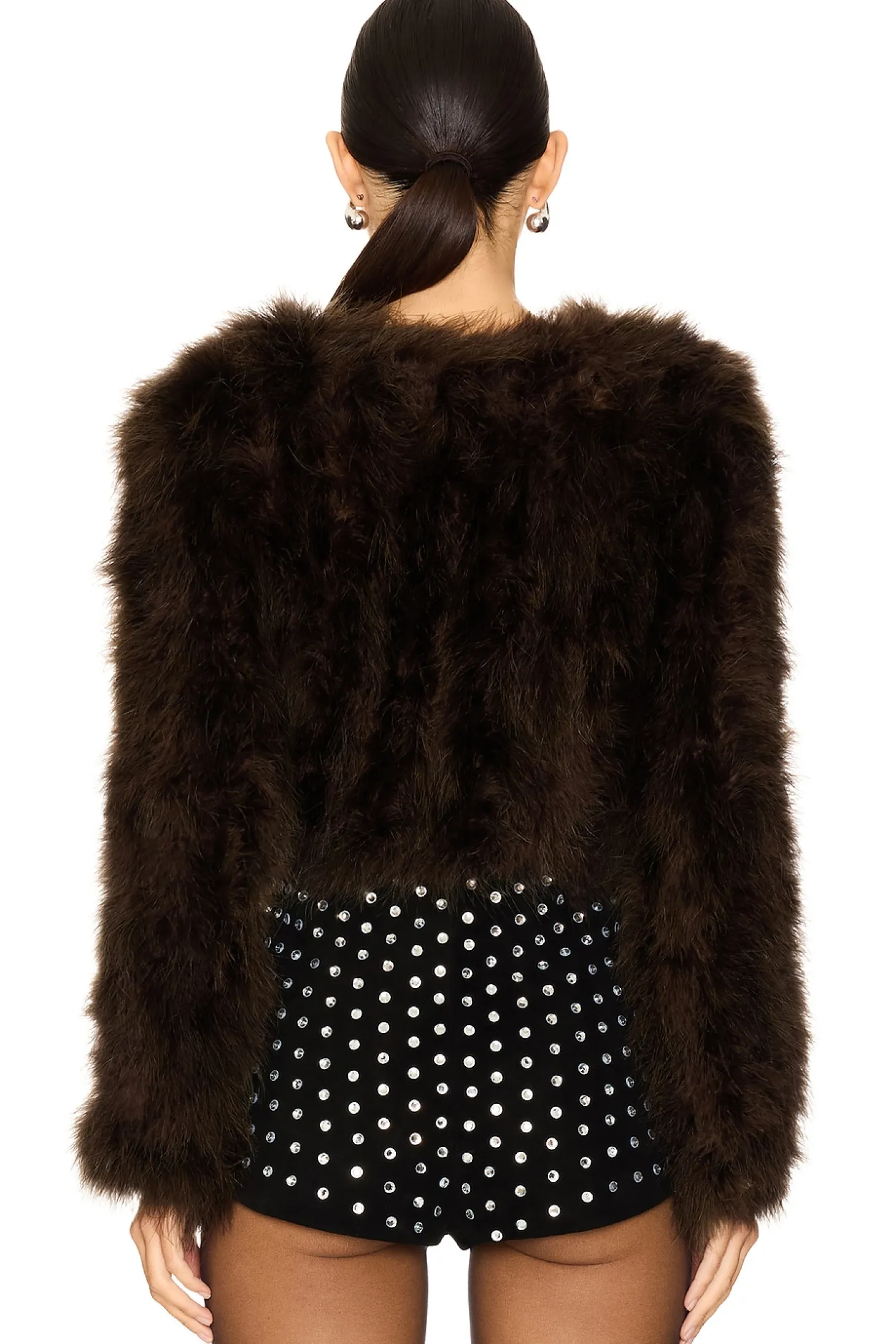 Self: real turkey feather Lining: 100% polyester.Made in China.Dry clean only.Front button closure.Feather treatment: dyed Feather Origin: USA.Feather exterior and satin lining