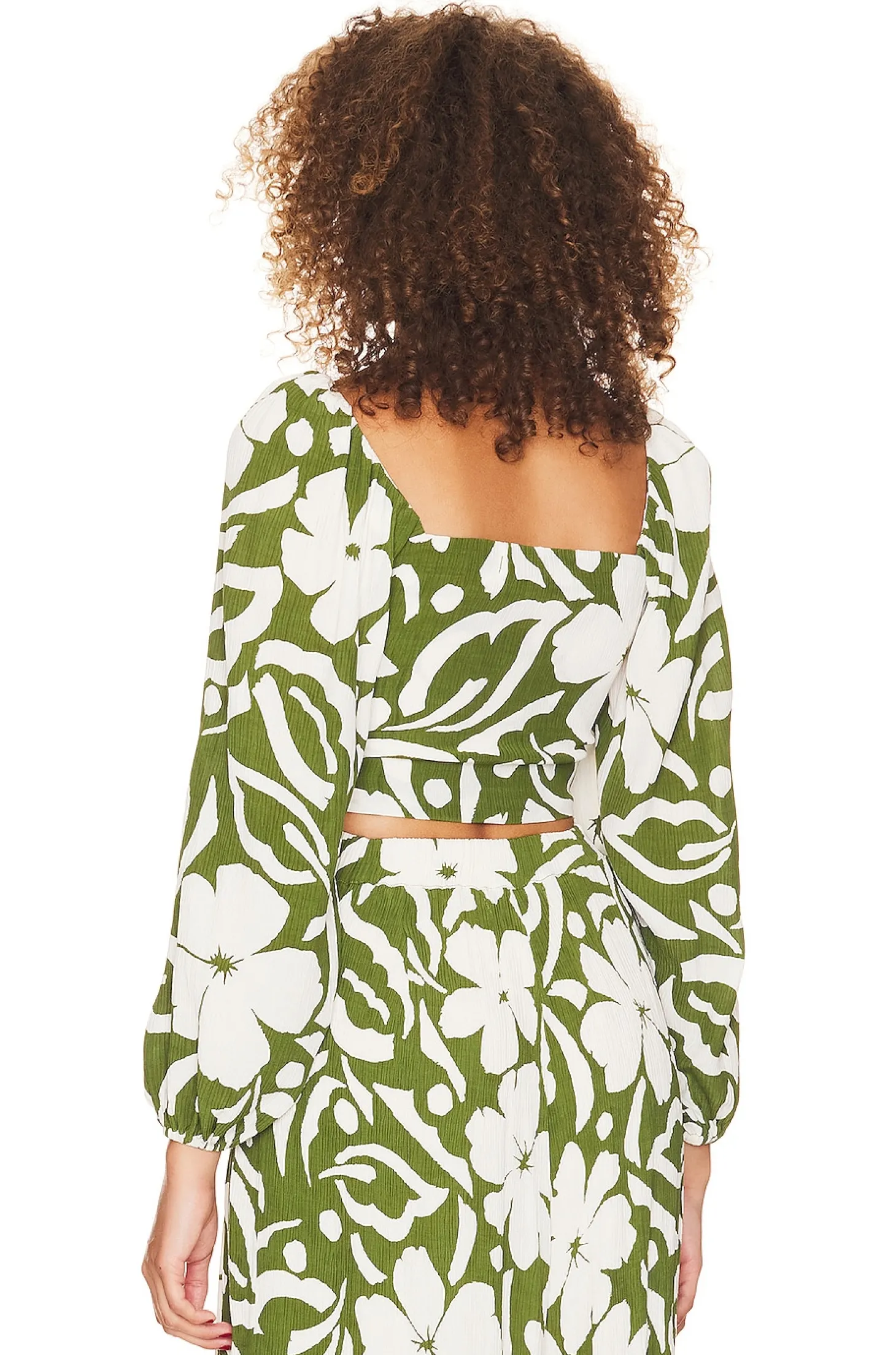 100% rayon.Made in Indonesia.Hand wash.Front tie closure.Puff sleeves with elastic cuffs.Pleated gauze fabric.Item not sold as a set