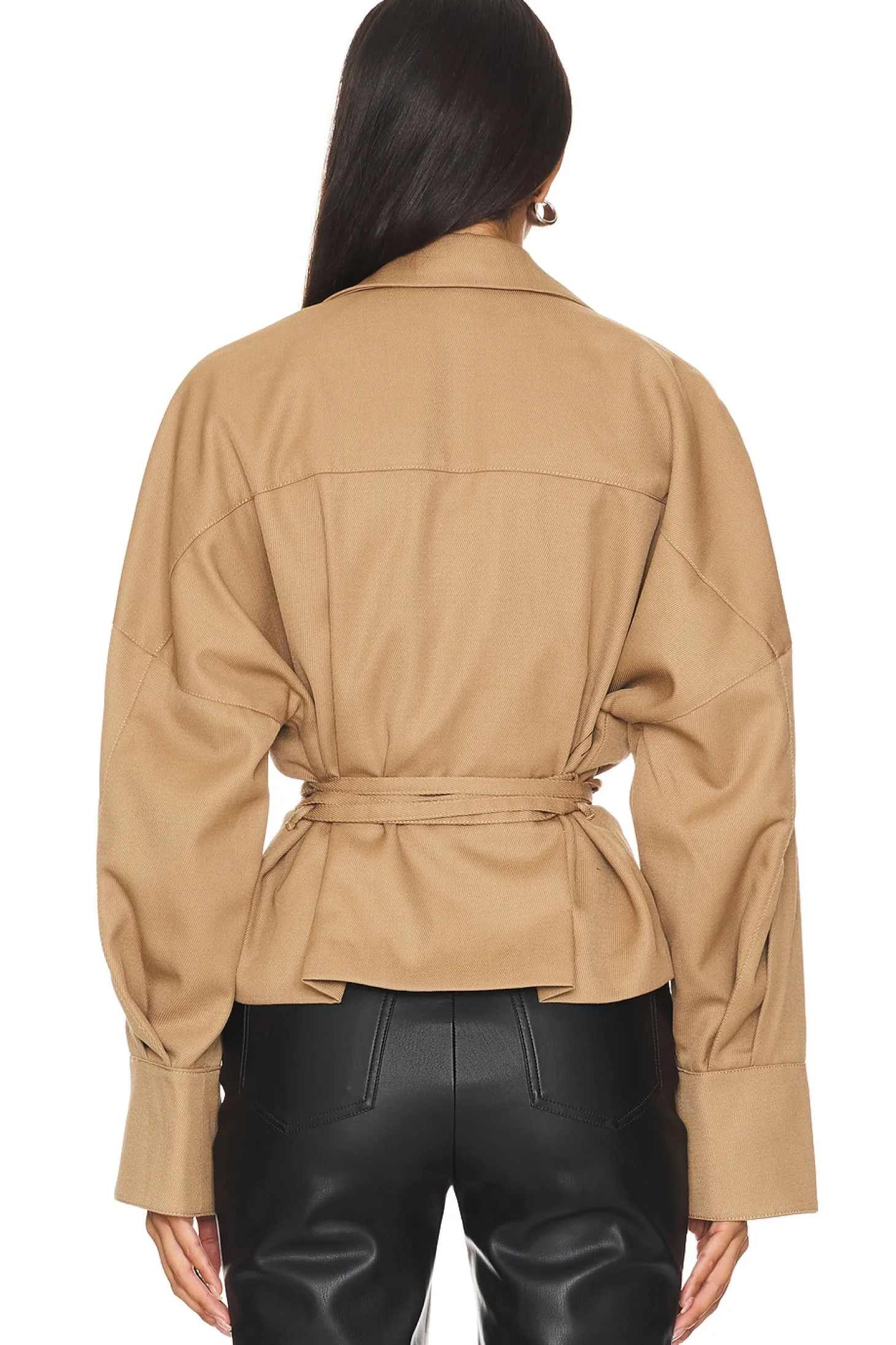 Self: 50% wool 50% polyester Lining: 55% polyester 45% viscose.Made in China.Dry clean.Front button closure.Dual flap pockets with button closure at front.Detachable waist tie closure.Twill fabric with notched lapels