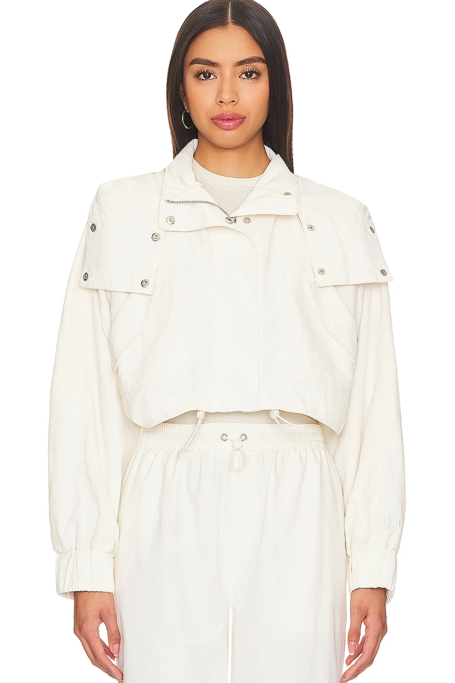 100% recycled nylon.Made in China.Hand wash.Front zipper and snap button closure.Detachable hood with snap button closure at neckline.Side seam pockets with snap button detail.Lightweight gabardine fabric with drawcord hem and cinched cuffs.Item not sold as a set