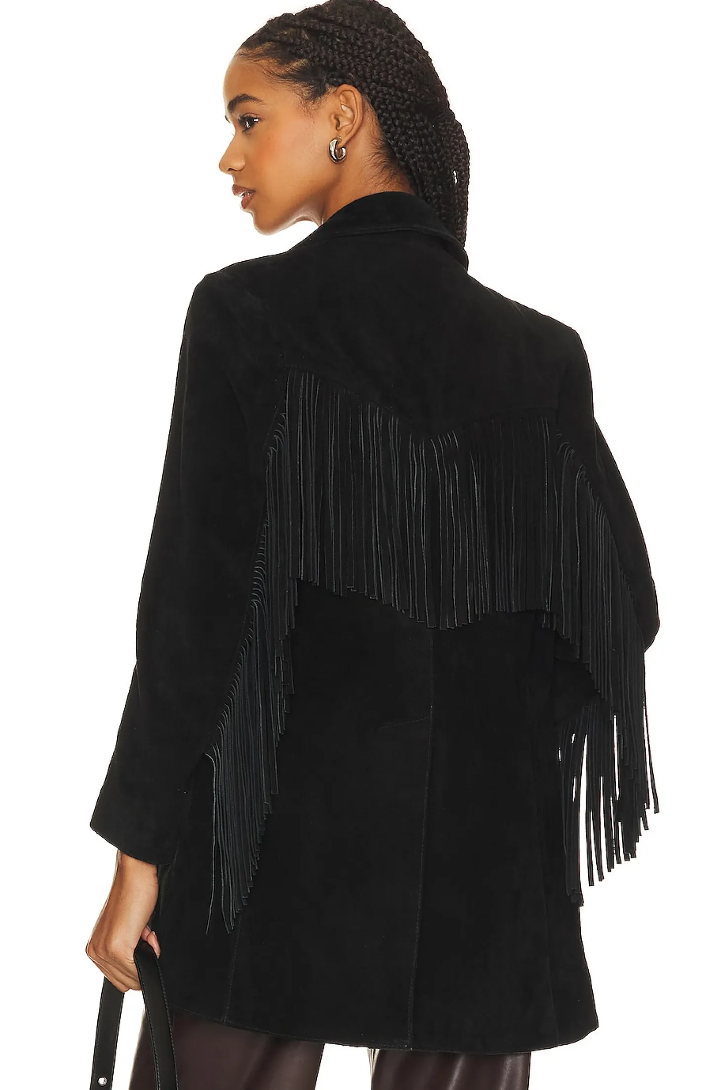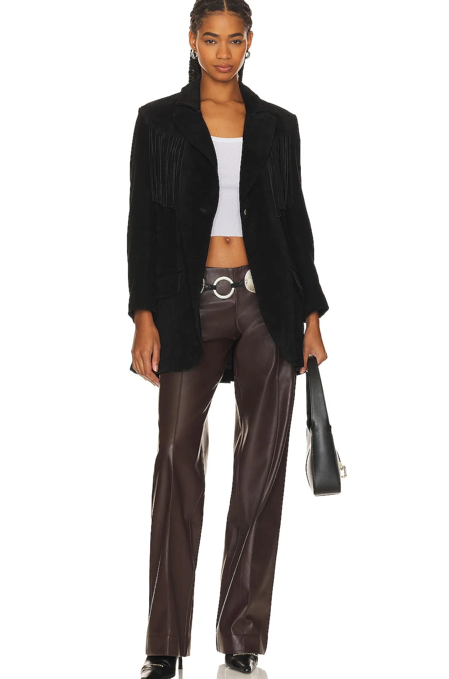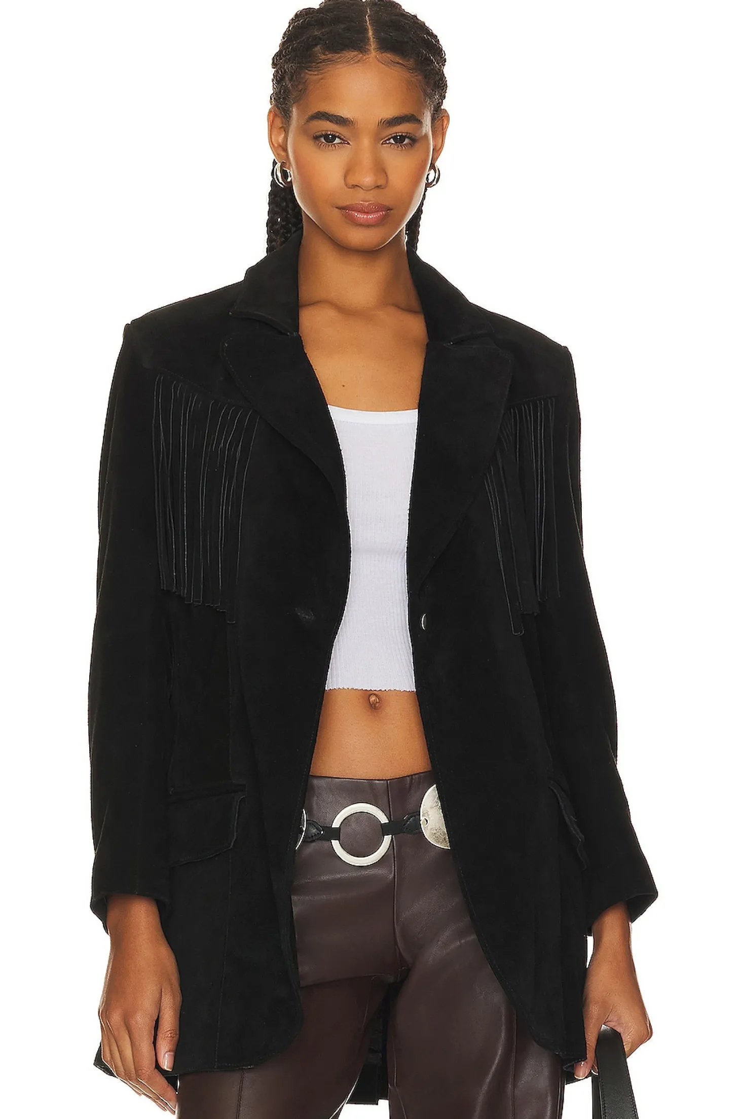 Self: 100% leather Lining: 100% polyester.Imported.Professional leather clean only.Singular front button closure.Fringe trim at lapel and back.Heavyweight suede fabric
