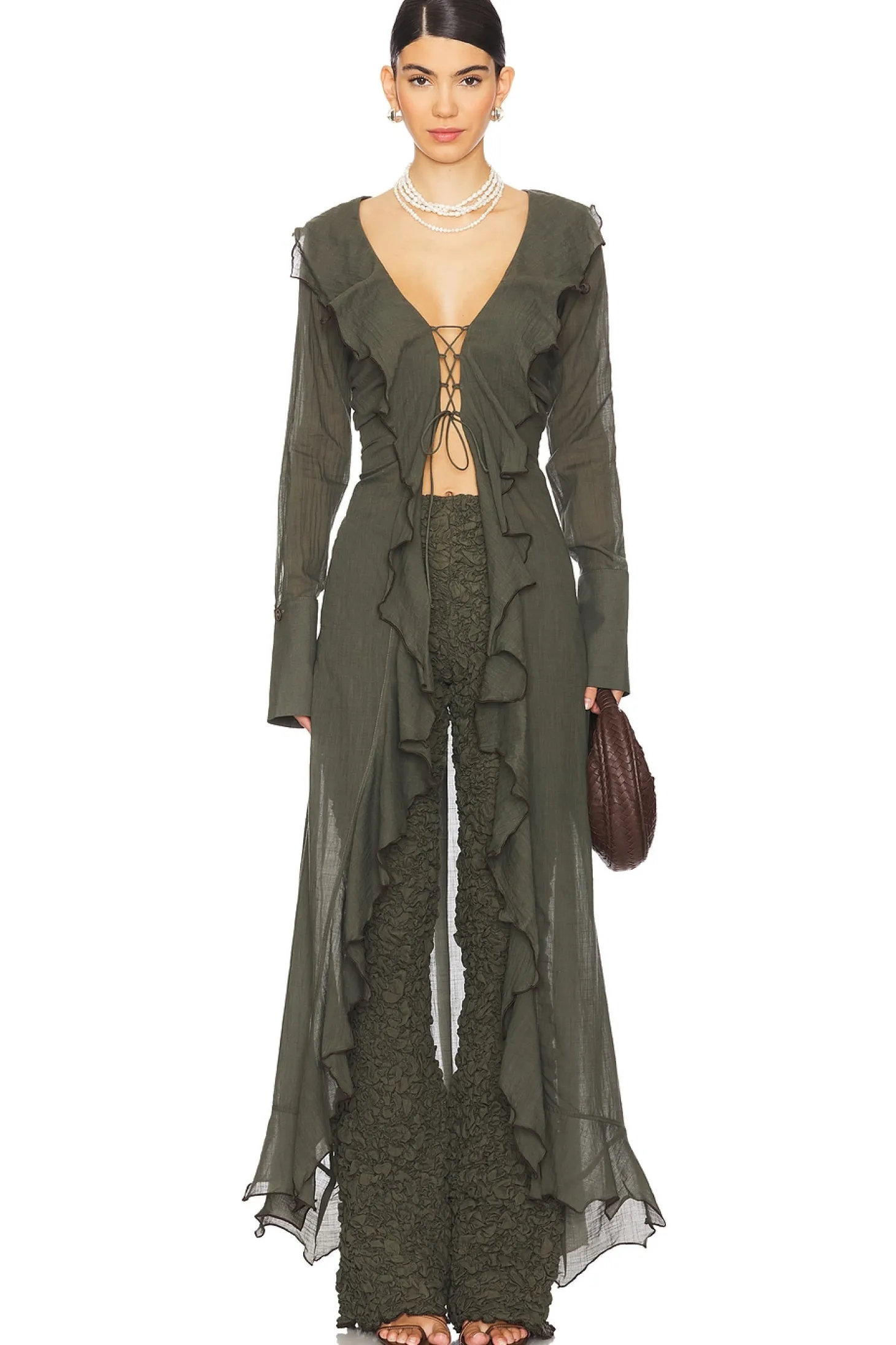 90% cotton 5% nettle 5% linen.Made in Ukraine.Machine wash.Unlined.Front tie-up closure.Buttoned cuffs.Organza fabric with ruffle at trim Item not sold as set
