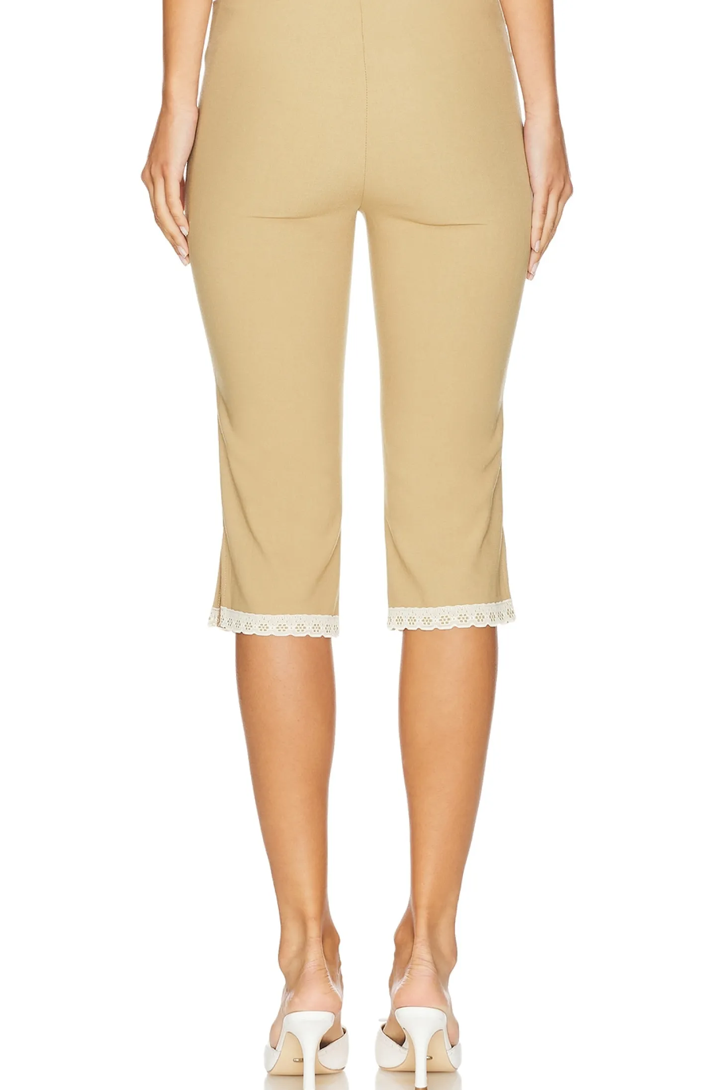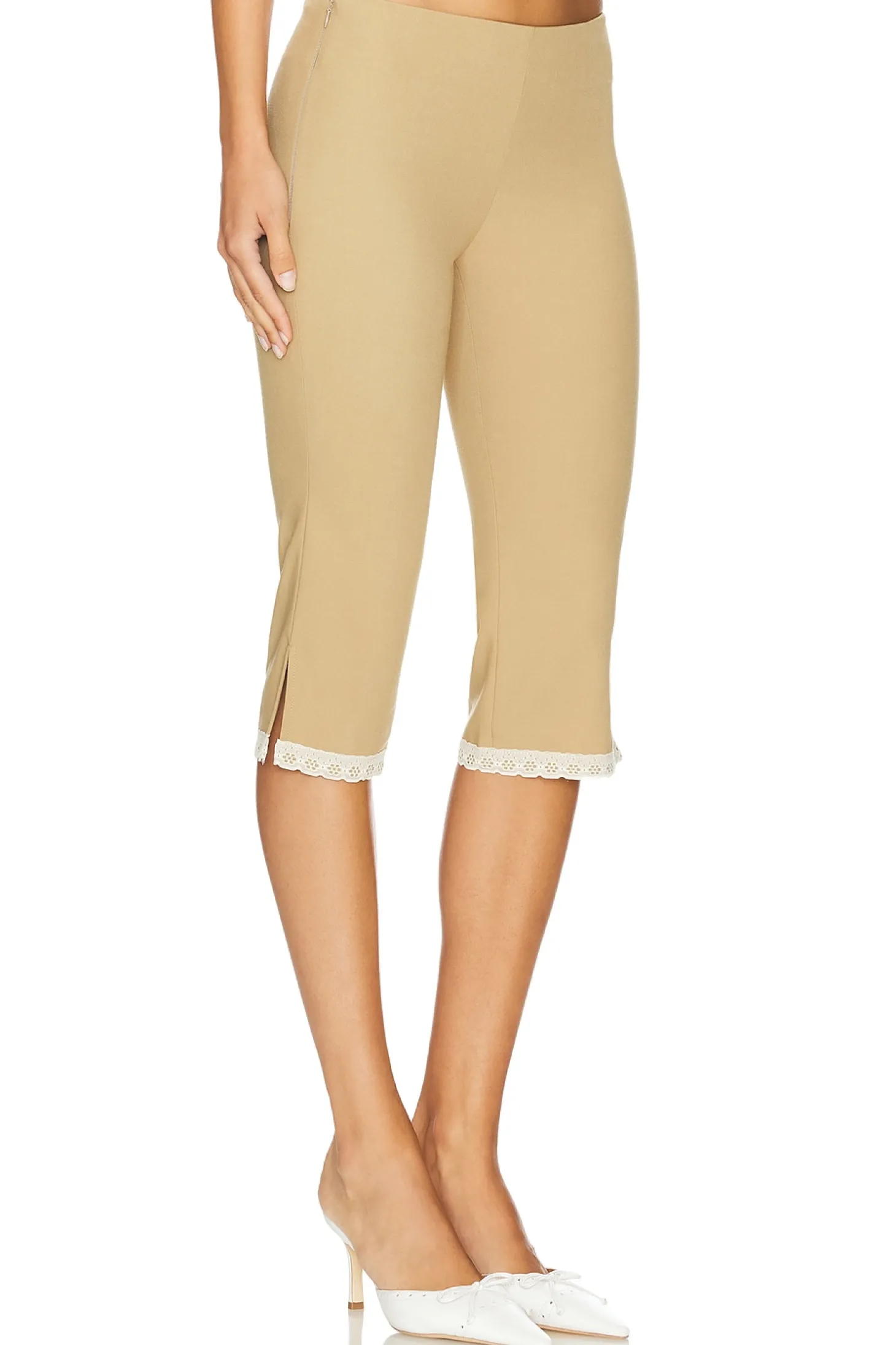 70% polyester 23% rayon 2% tencel 2% acetate 3% spandex.Made in China.Machine wash.Hidden side zipper closure.Jersey fabric and slit hem with lace trim.17" at the knee narrows to 14" at the leg opening