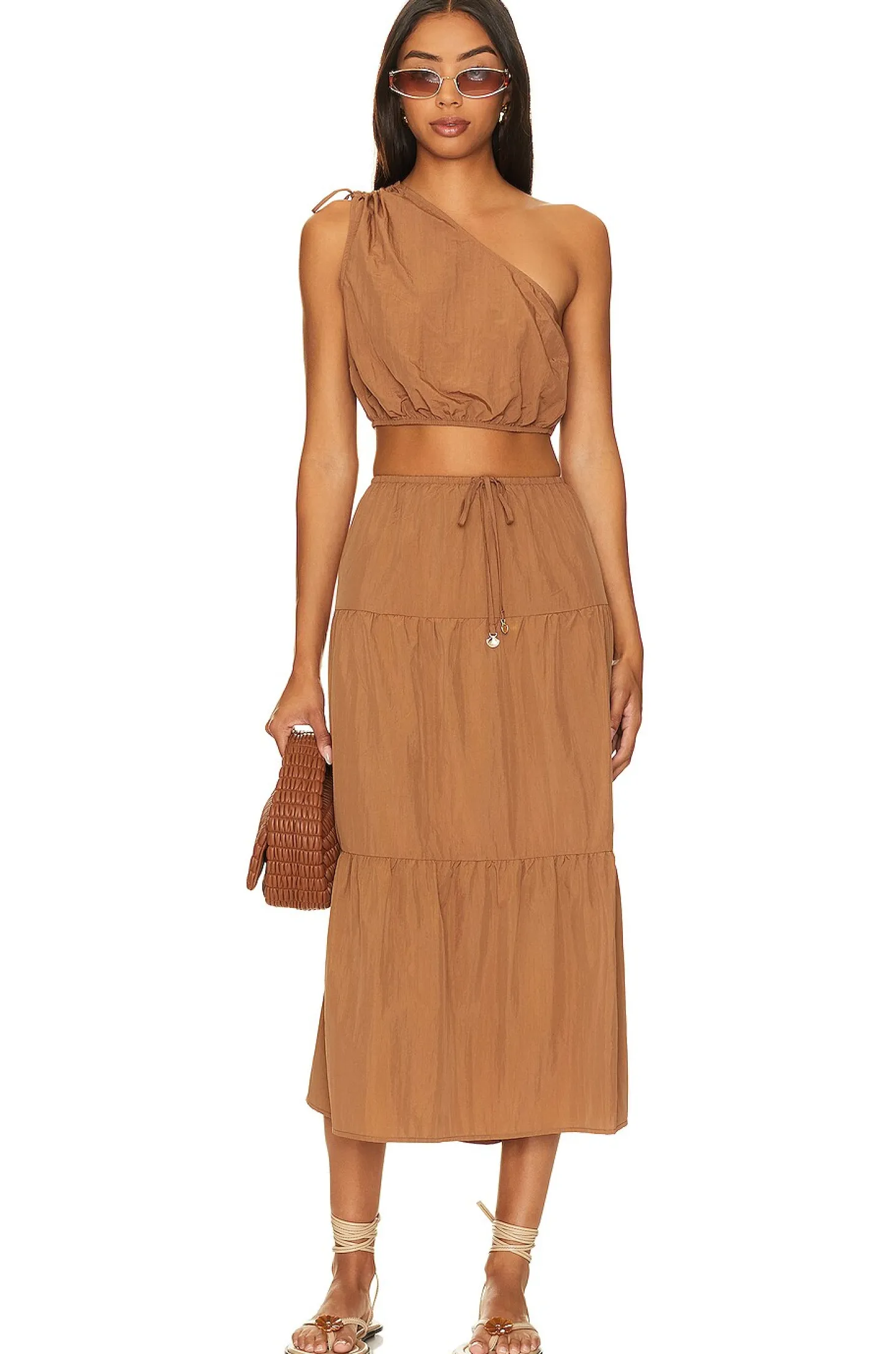 100% nylon.Made in China.Dry clean only.Unlined.Pull-on styling with drawstring waist.Ripstop fabric.Item not sold as a set.Skirt measures approx 33" in length