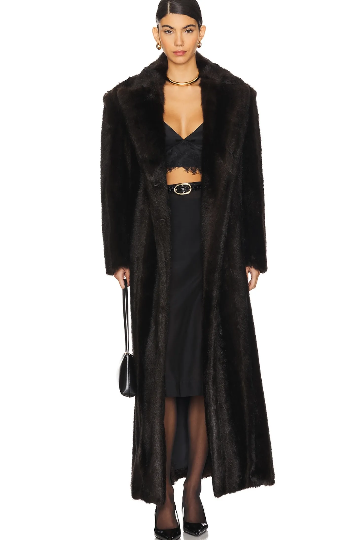 Self: 81% modacrylic 19% polyester Lining: 100% polyester.Made in China.Dry clean only.Dual hook and eye closure.Side pockets.Interior breast pocket.Faux fur with padded shoulders