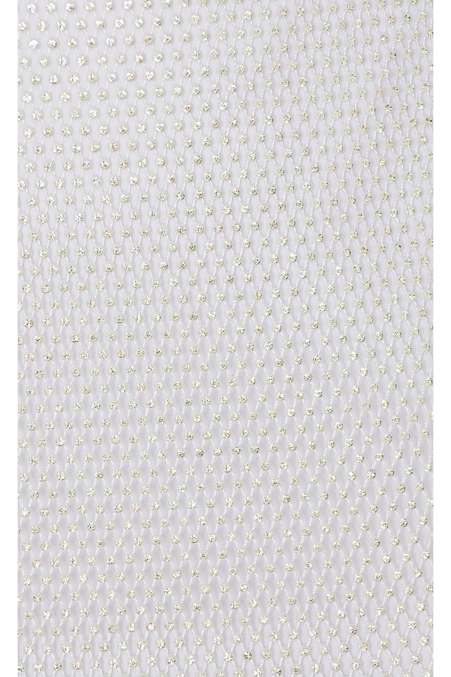 50% rhinestones 30% polyester 20% cotton.Made in Ukraine.Dry clean only.Unlined.Pull-on styling with elastic neckline trim.Open knit fabric with rhinestone embellishments throughout with back vent.Neckline to hem measures approx 57" in length