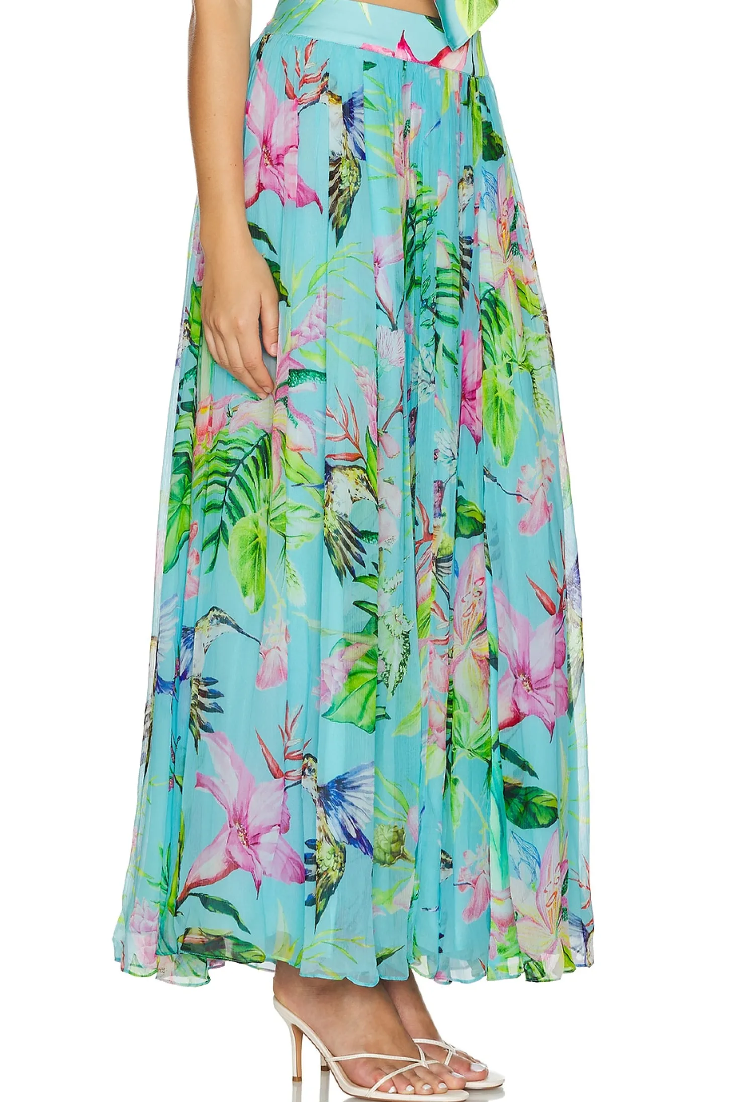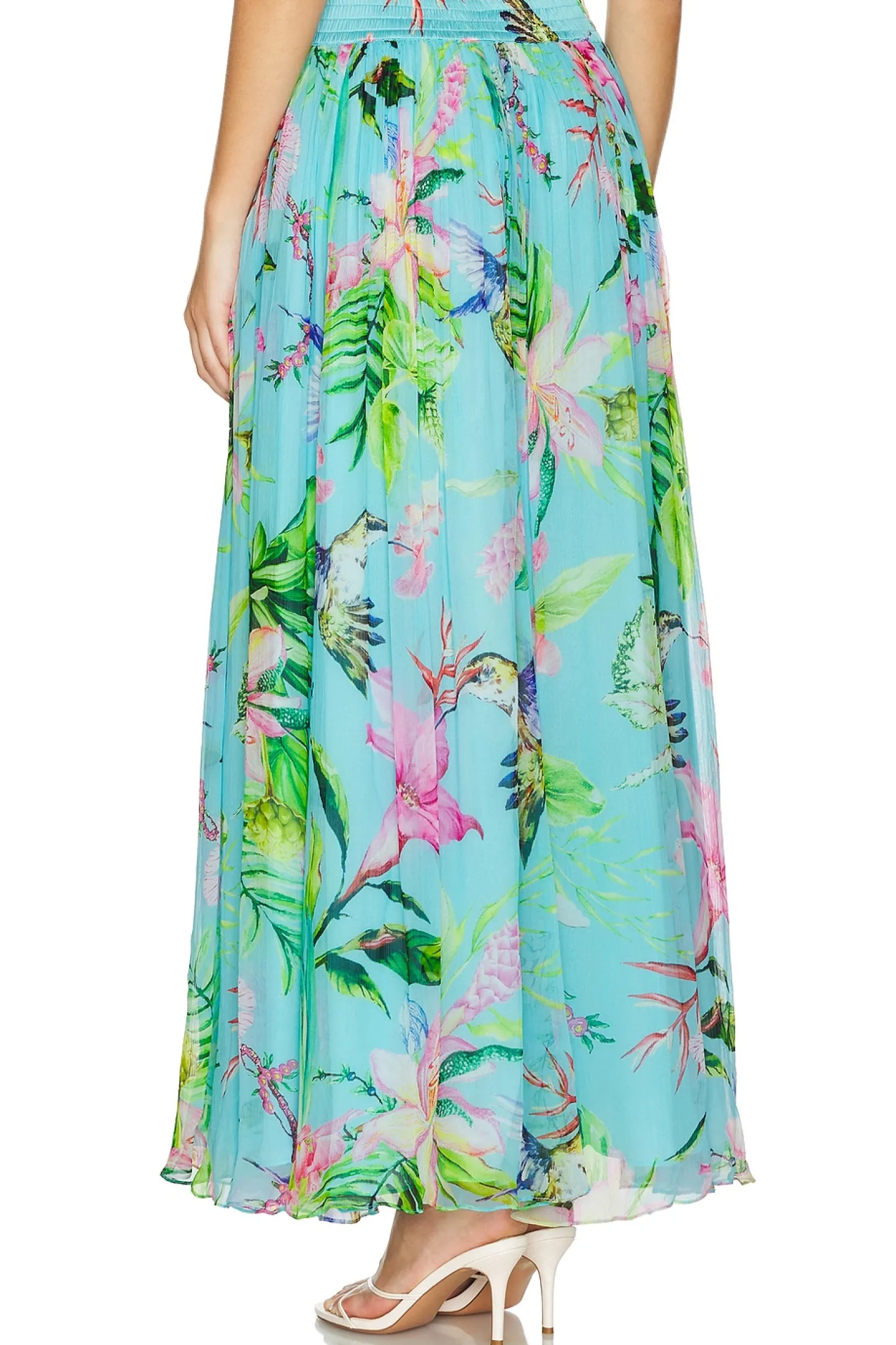 100% viscose.Made in India.Dry clean.Fully lined.Hidden side zipper closure.Skirt measures approx 40" in length