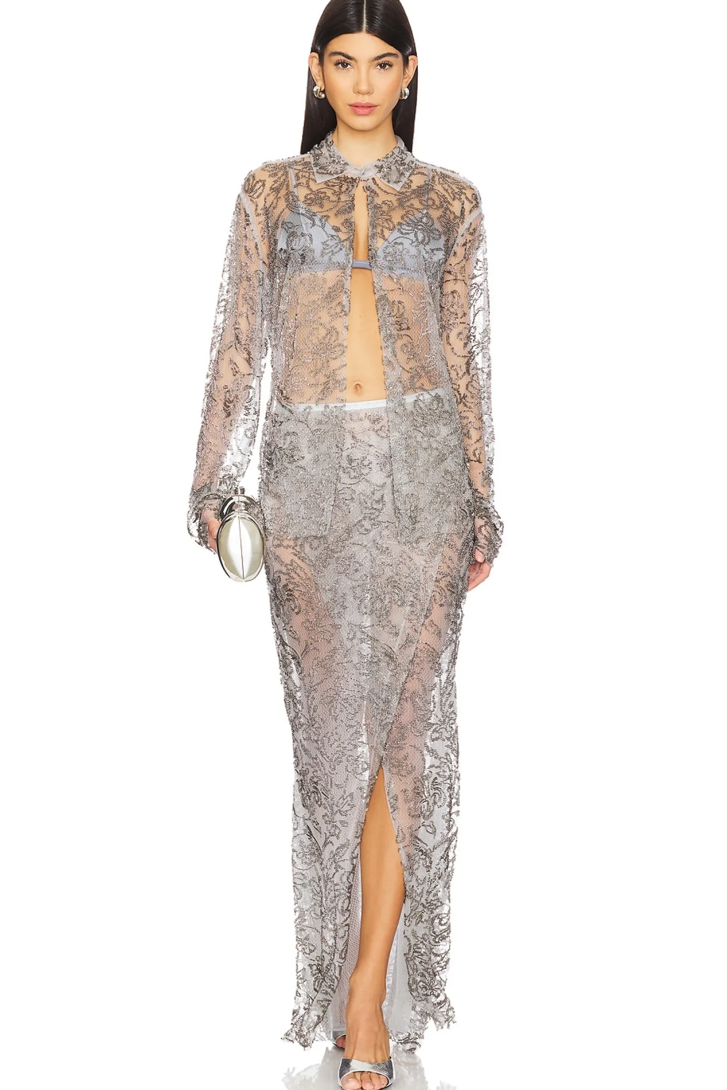 100% polyamide.Made in China.Hand wash.Fully lined.Singular button snap closure at left hip.Wrap styling.Beaded floral embellished fabric Garment is intentionally sheer, undergarments will show through. Please note undergarment not included Item not sold as a set.Waist to shortest hem measures approx 26" and to longest hem approx 46" in length
