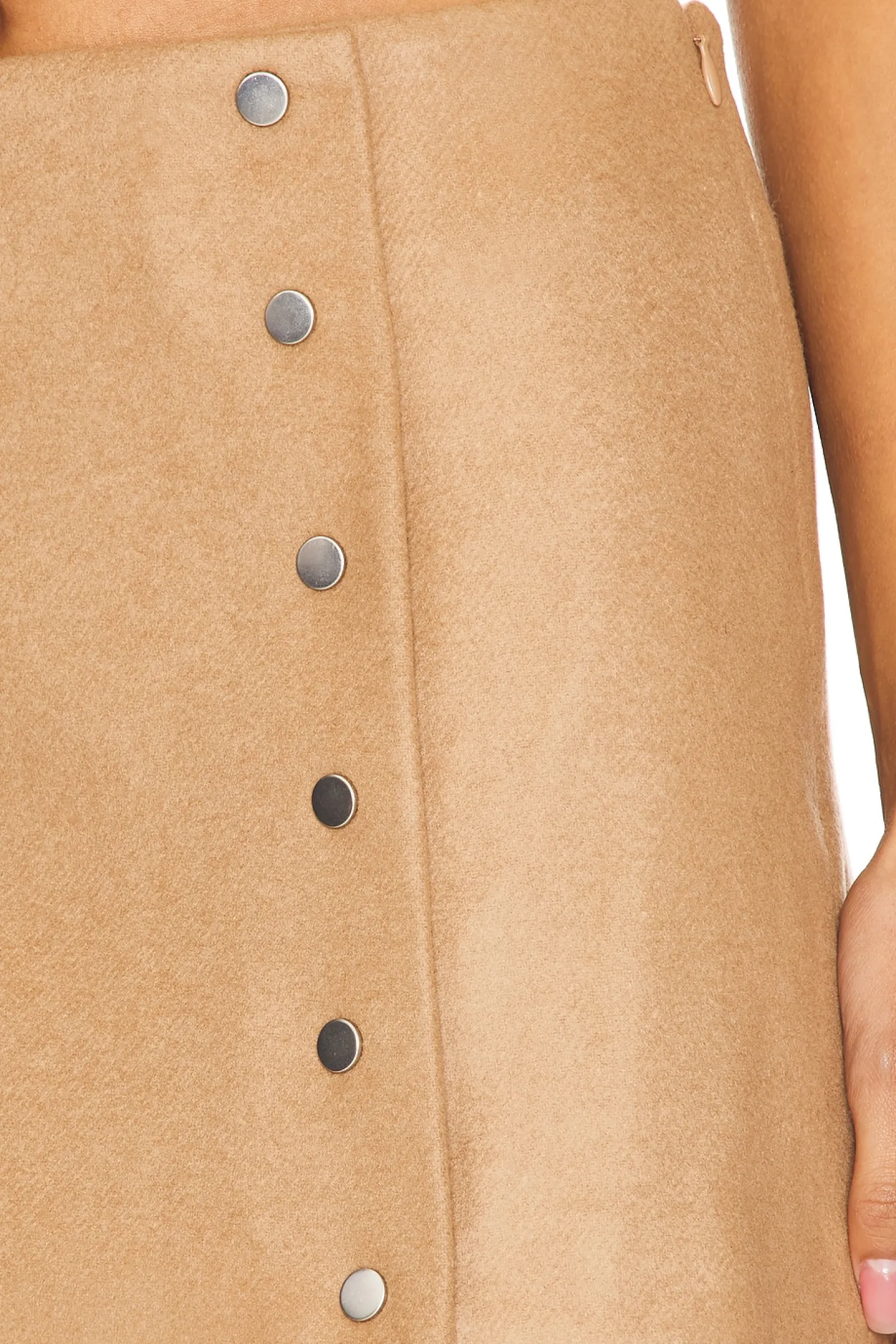 Self: 67% wool 25% polyamide 8% cashmere Lining: 51% polyester 49% cotton.Made in China.Dry clean only.Double lined.Hidden side zipper closure.Front snap button detail.Midweight melton fabric Item not sold as a set.Skirt measures approx 13" in length