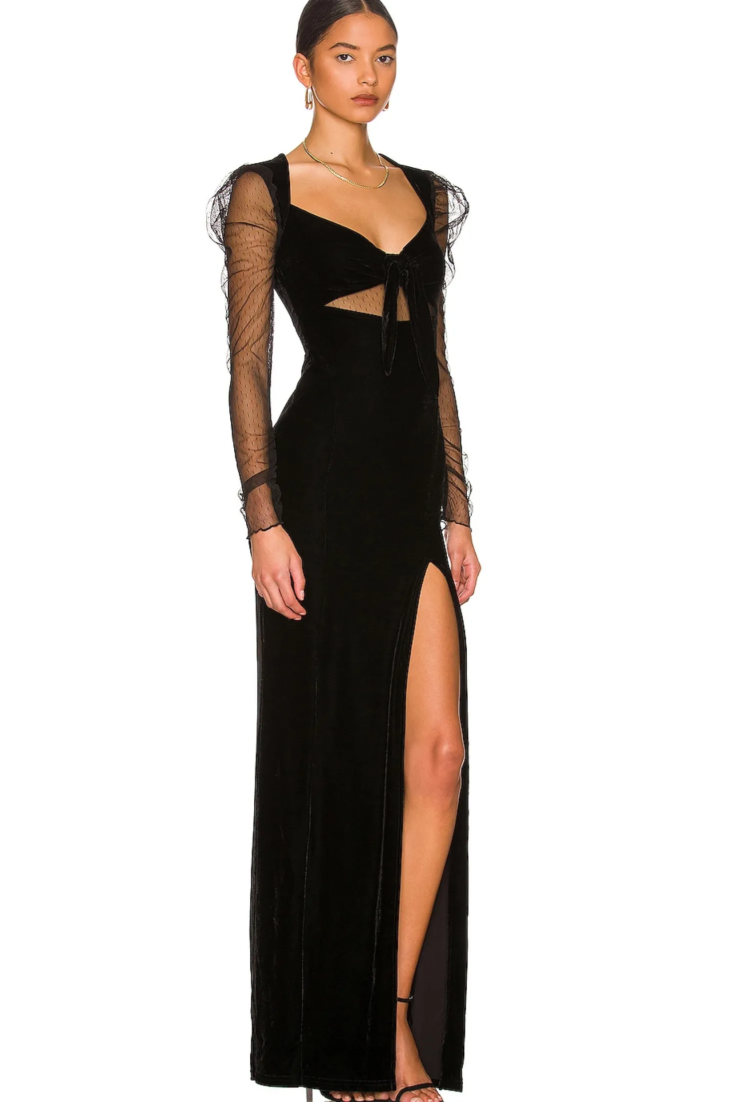 Self: 93% poly 7% elastane Lining: 94% poly 6% elastane Trim: 100% poly.Made in China.Hand wash.Fully lined.Hidden back zipper closure Back keyhole with loop button closure.Front bust tie closure with cut-out mesh panel.Sheer mesh sleeves with shirred puff shoulders Velvet fabric with side seam slit