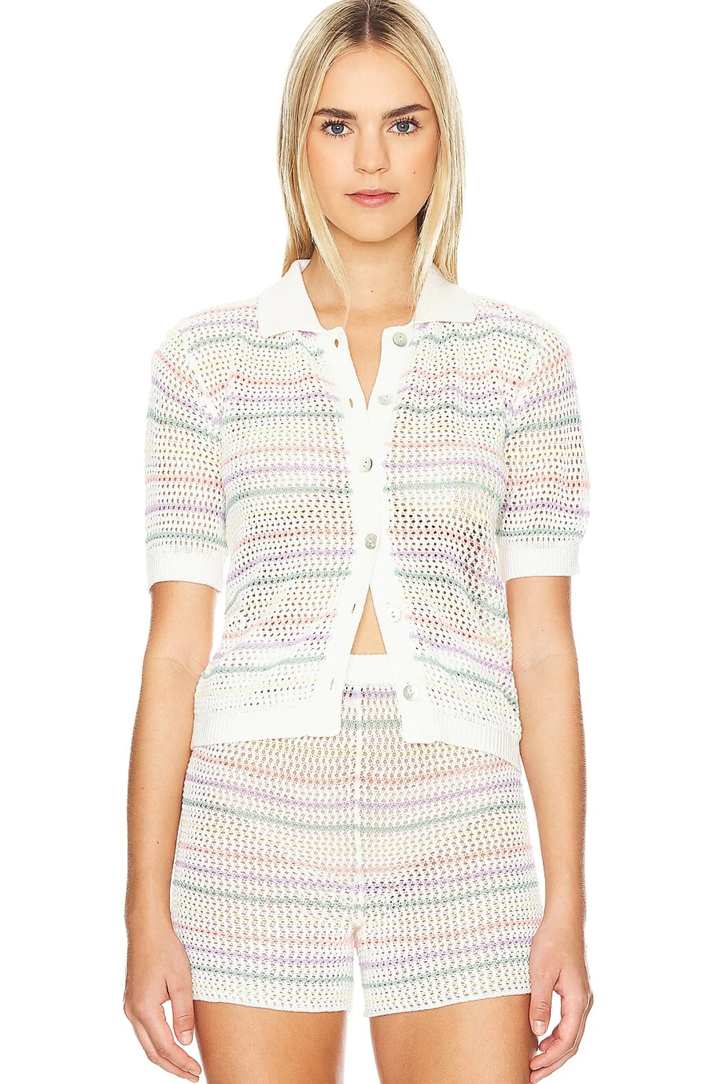 100% acrylic.Made in Peru.Machine wash.Front button closure.Lightweight open crochet fabric.Item not sold as a set