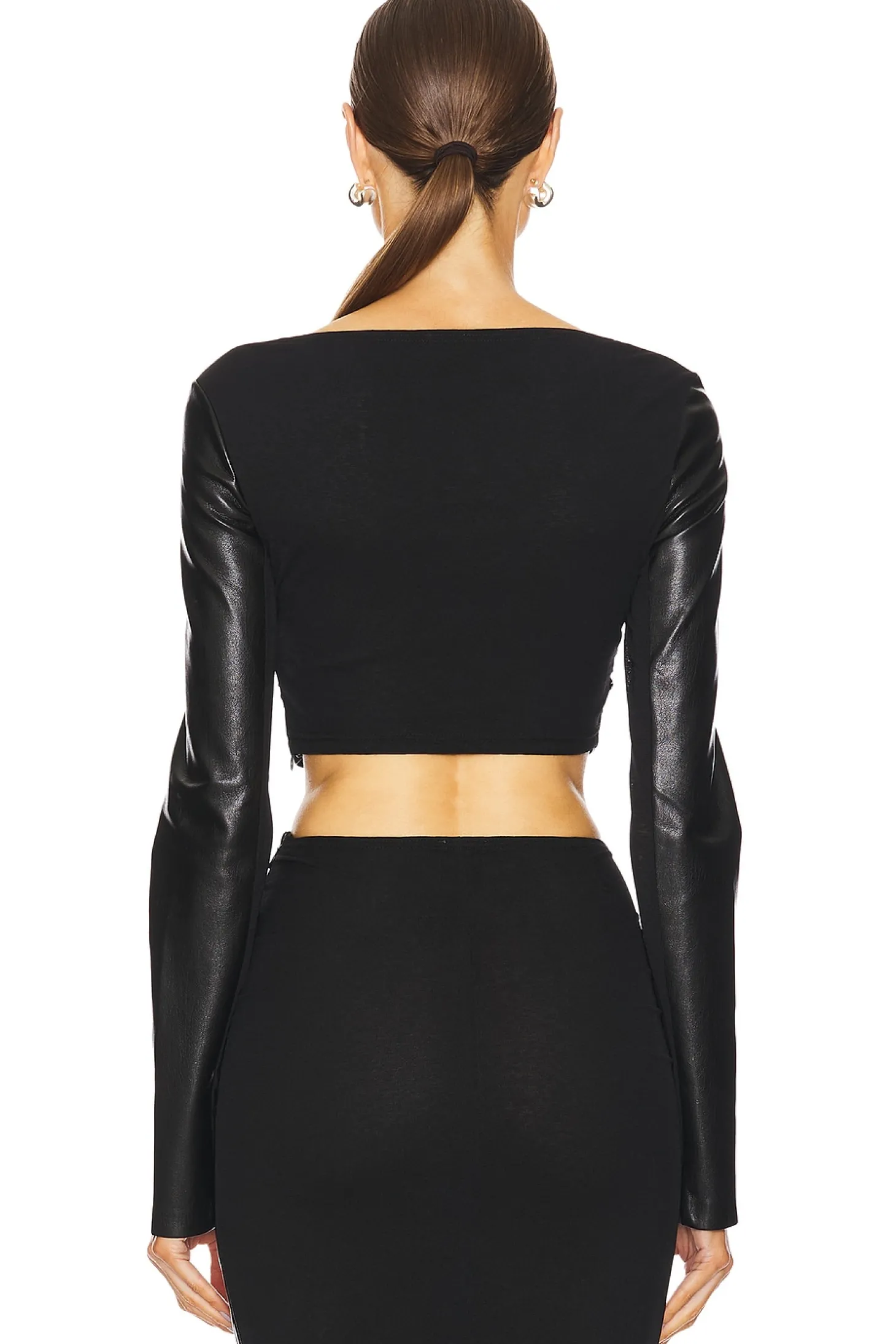 Self 1: 100% polyurethane Self 2: 100% polyester Lining: 100% polyester.Made in China.Dry clean.Hidden side zipper closure.Scoop -neck design.Faux leather fabric at front with slinky knit contrast at back.Item not sold as set