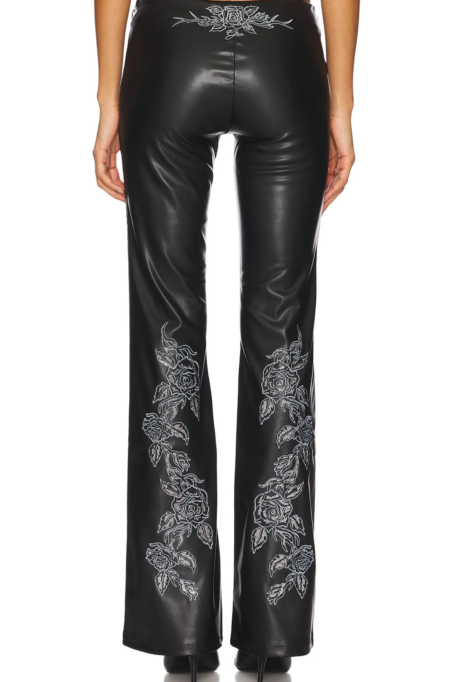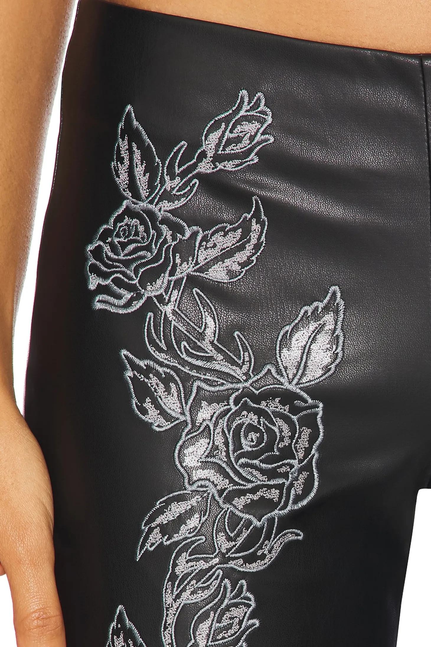 Self 1: 100% polyurethane Self 2: 100% polyester.Made in China.Hand wash.Hidden side zipper closure.Faux leather with embroidered floral details.Item not sold as set.15" at the knee breaks to 19" at the leg opening