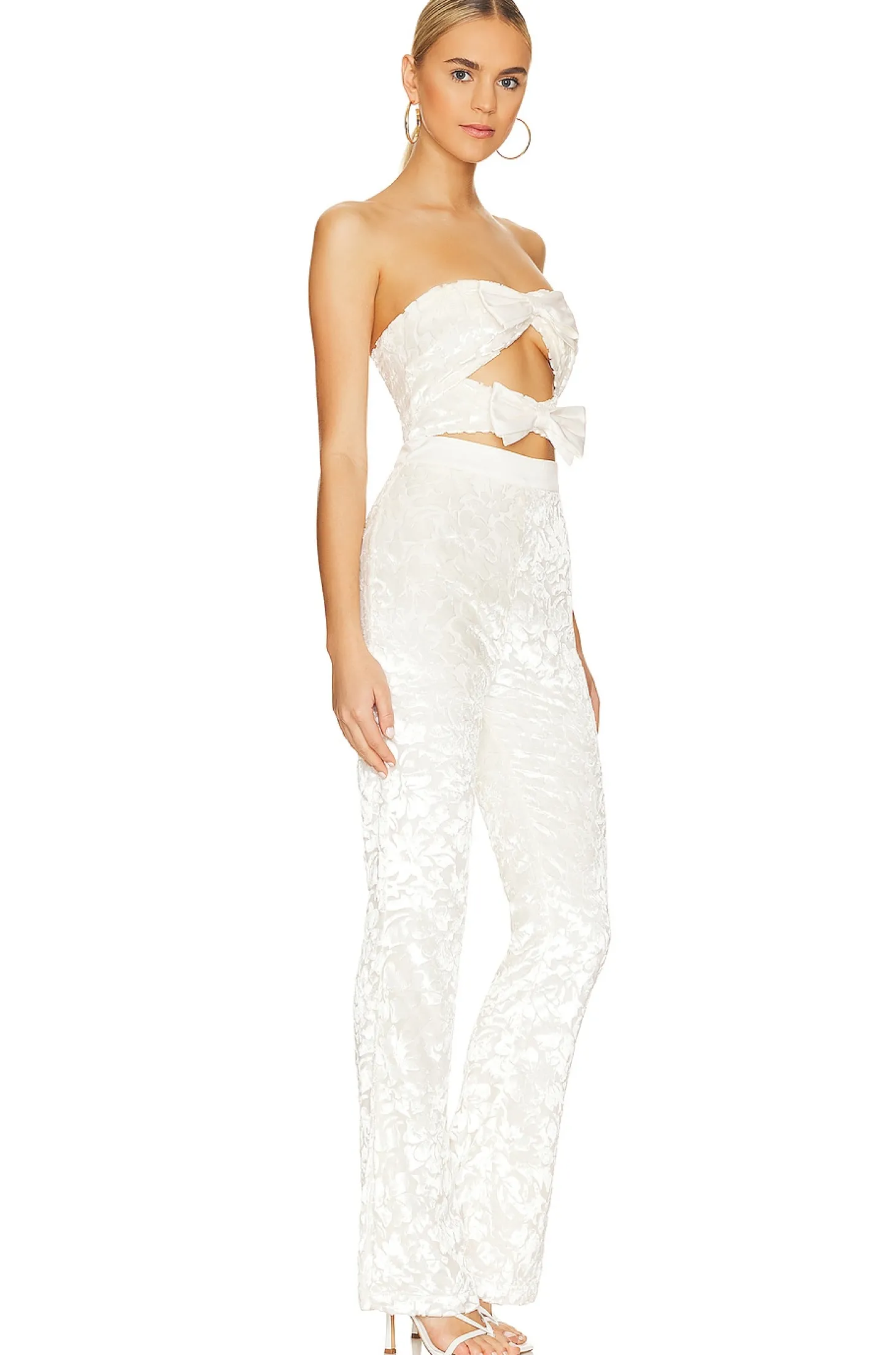 Self: 80% polyester 20% nylon Lining: 97% polyester 3% elastane.Made in China.Dry clean only.Hidden back zipper closure.Non-slip silicone grip neckline trim.Bodice cut-out with bow accents.Jersey fabric with burnout velvet fabric Side seam slit at hem.Neckline to hem measures approx 54" in length 14" at the knee and 14" at the leg opening
