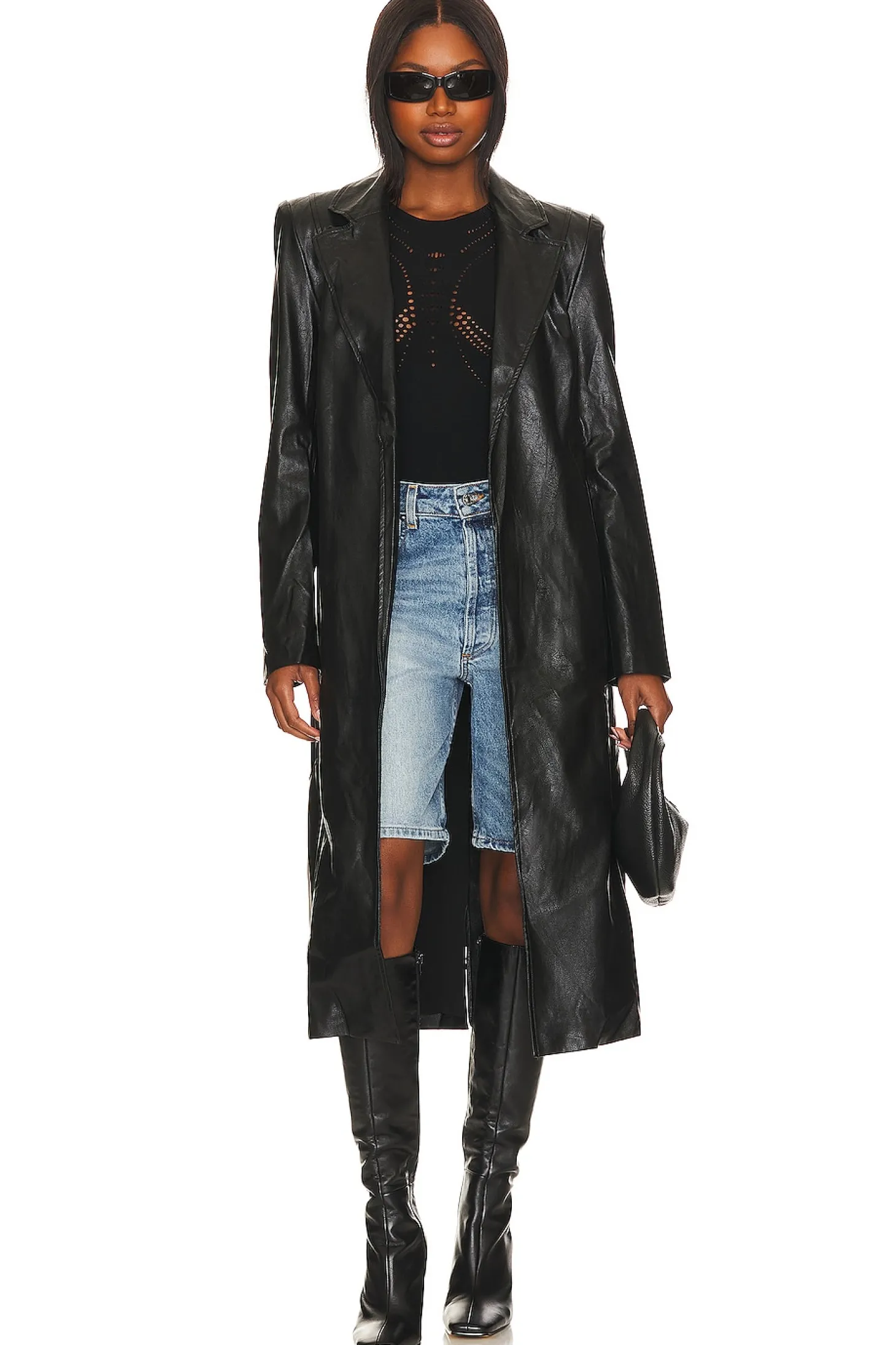 Self: 55% cotton 45% polyurethane Lining: 97% polyester 3% elastane.Made in China.Machine wash.Open front styling.Padded shoulders.Side seam pockets.Faux leather fabric with back slit