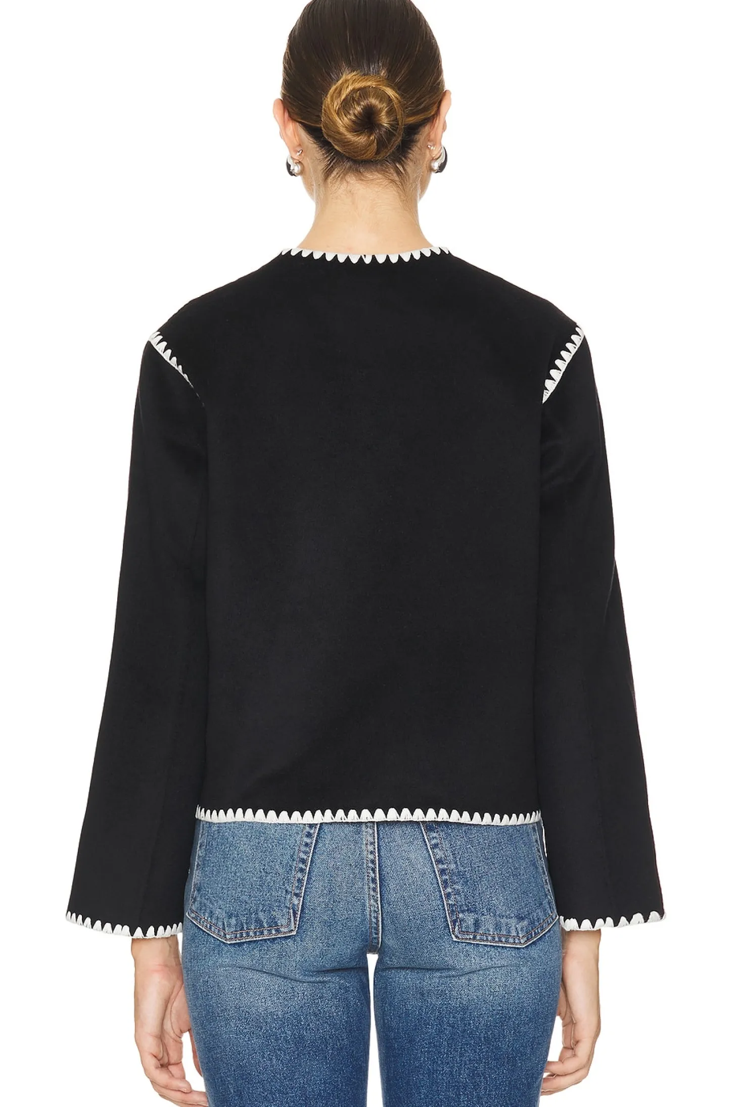 51% wool 49% polyester.Made in China.Dry clean only.Front button closure.Front pouch pockets.Whipstitch accent at trim.Twill fabric