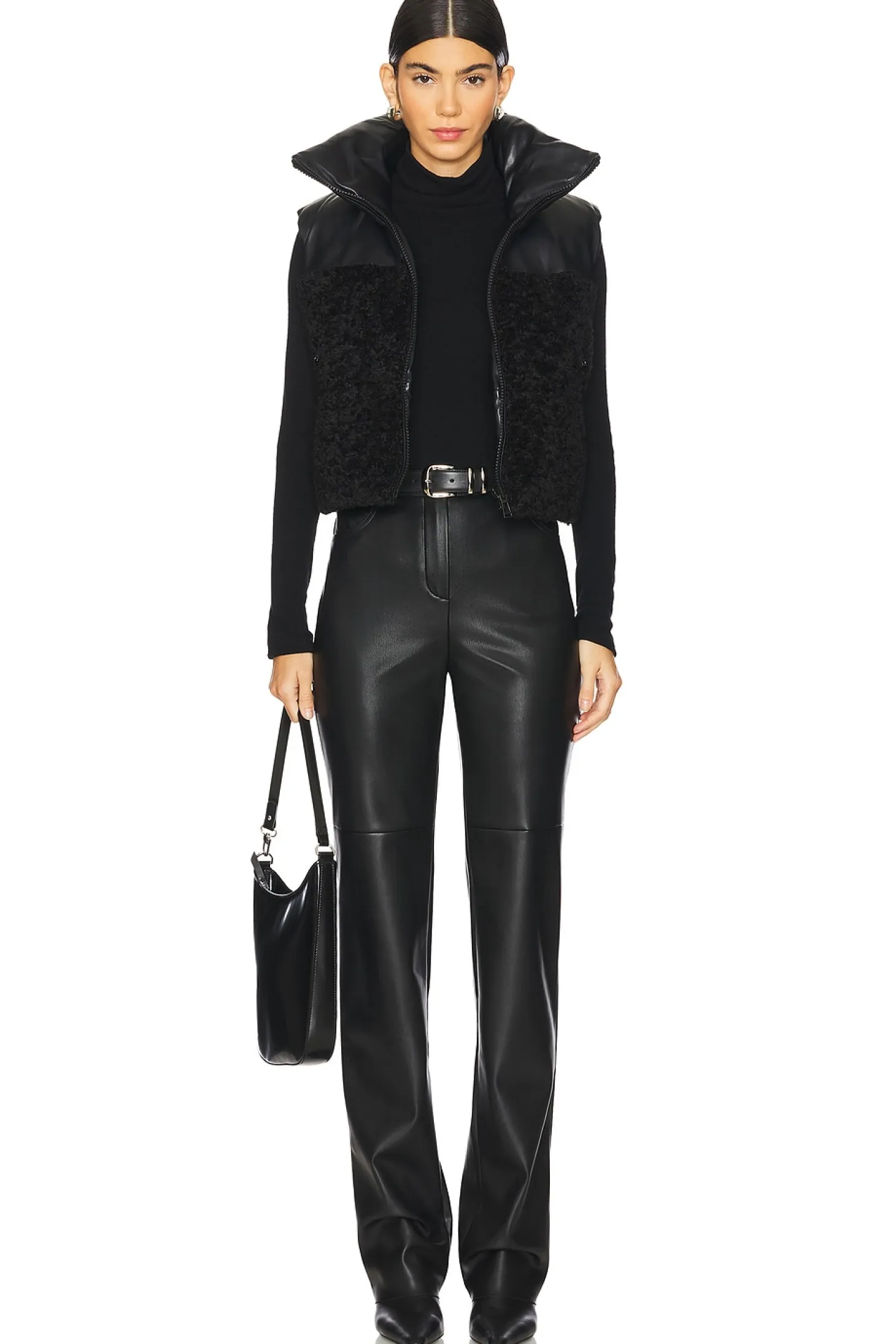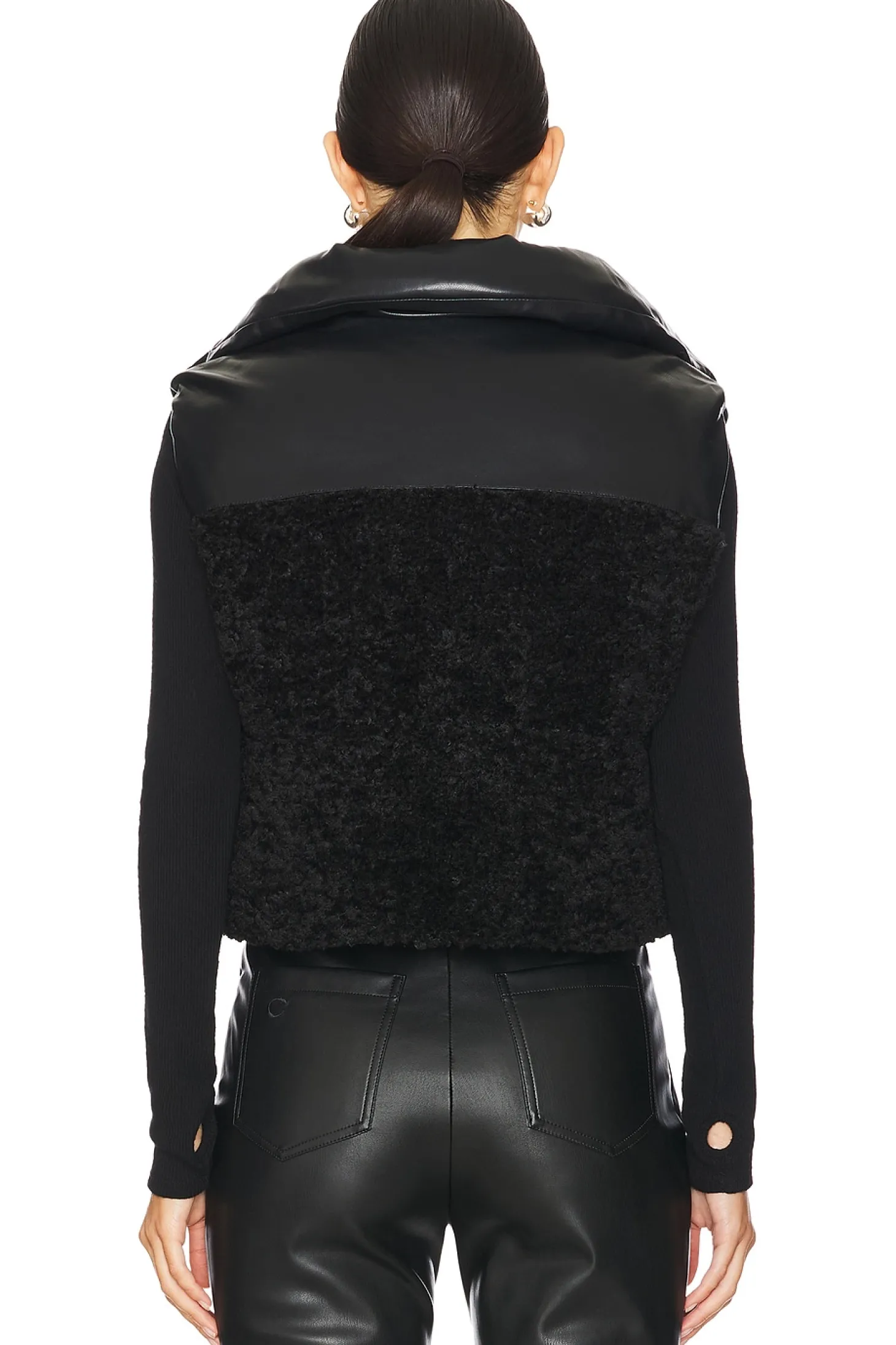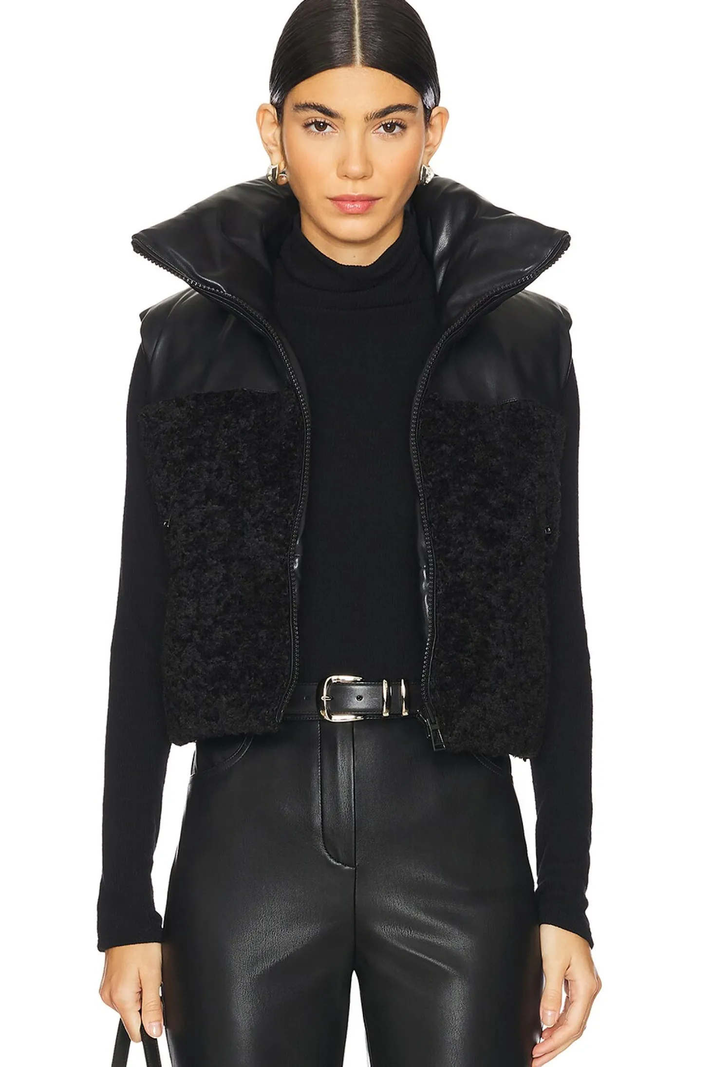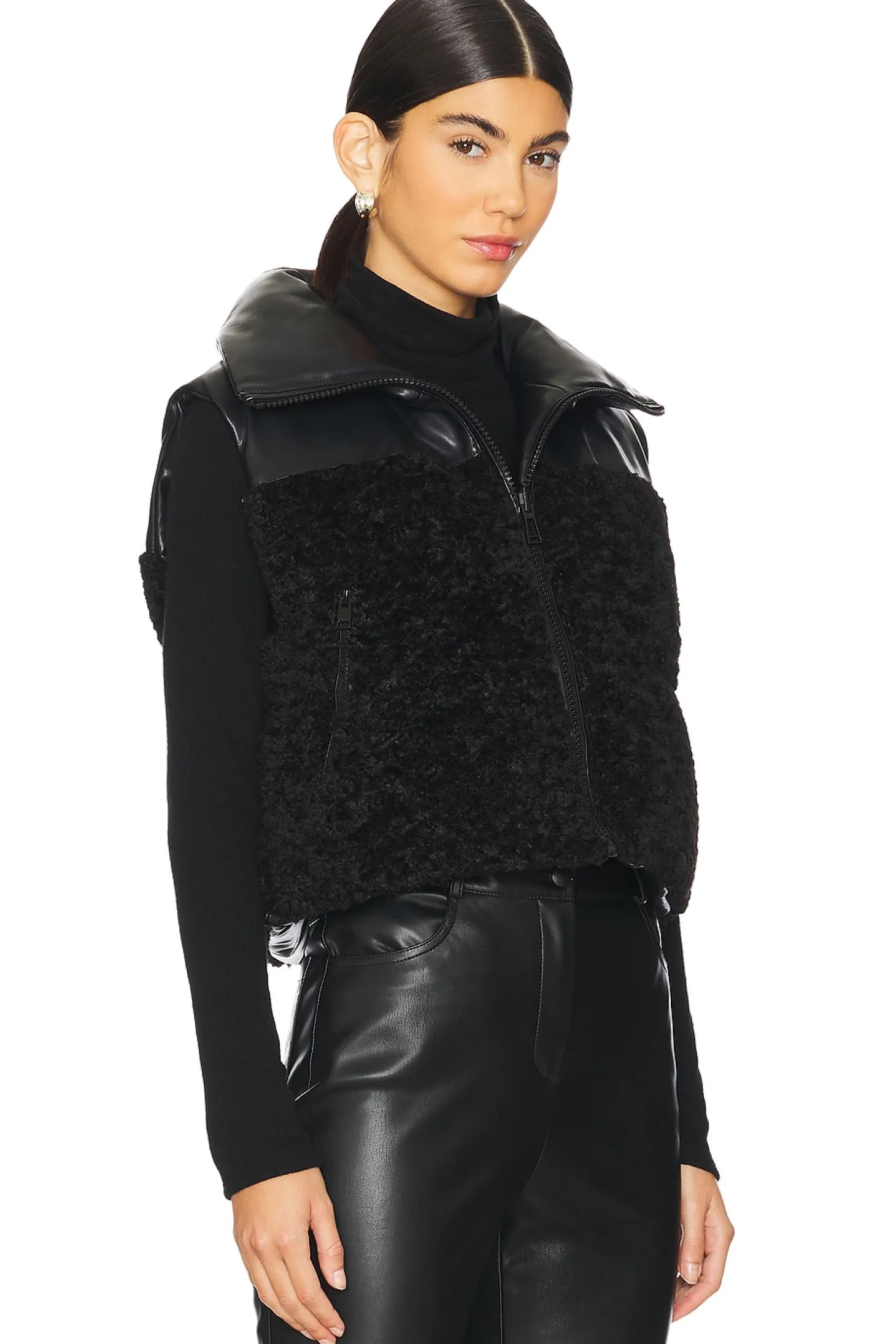 Self 1: 100% polyurethane Self 2 & Filling: 100% polyester.Made in China.Dry clean only.Front zip closure.Front zip pockets Elasticized drawcord hem.Heavyweight faux fur and faux leather fabric