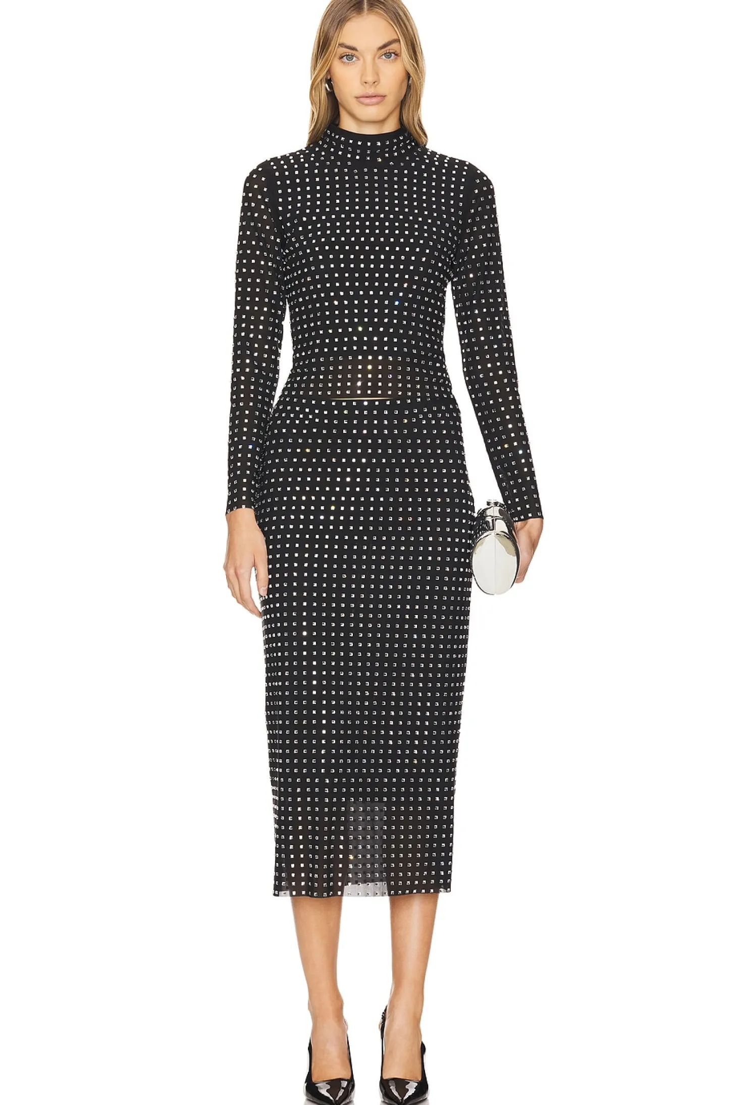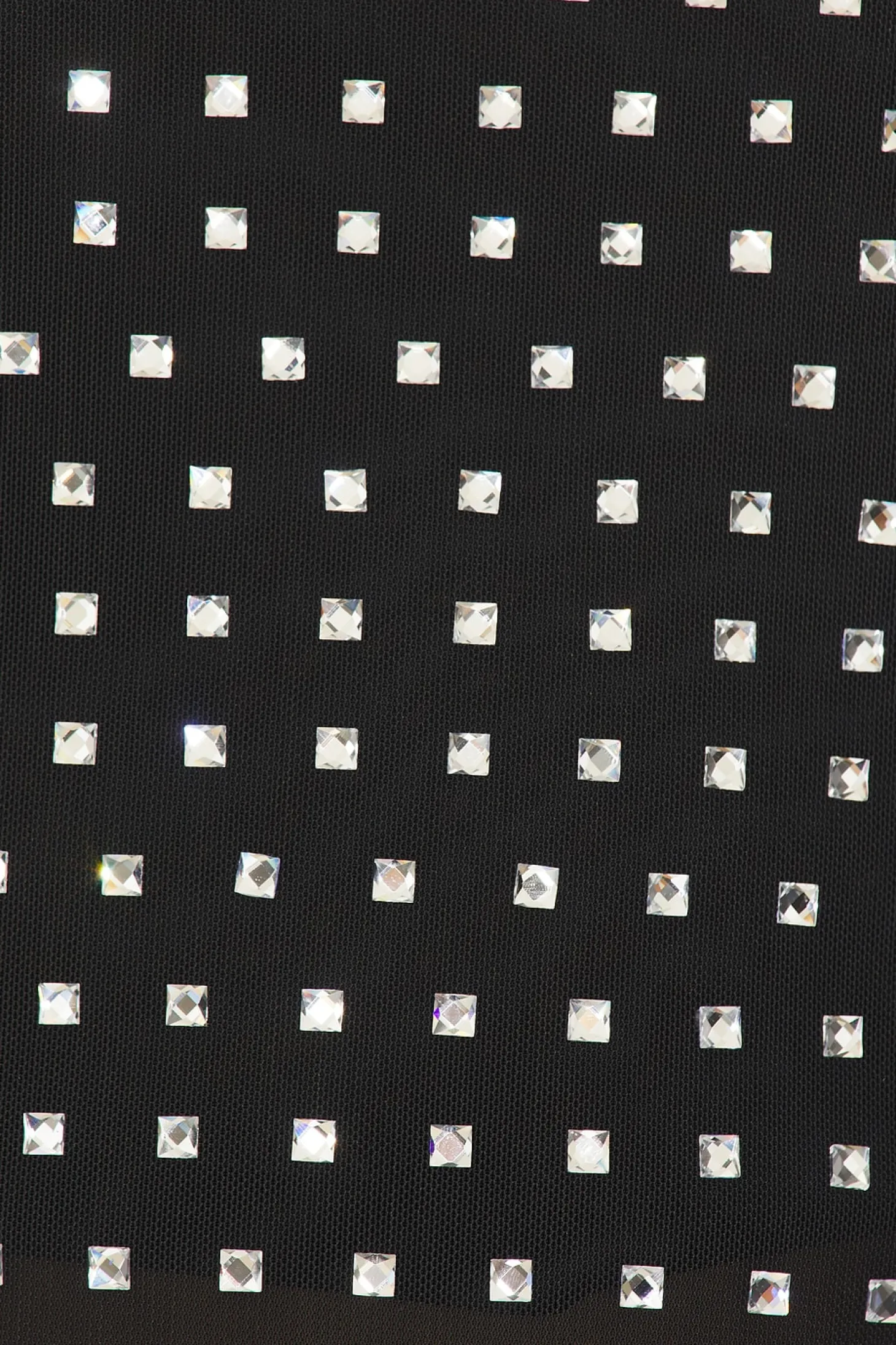 88% polyester 12% elastane.Made in China.Hand wash.Hidden back zipper closure.Mockneck styling.Crystal embellished mesh fabric.Item not sold as a set