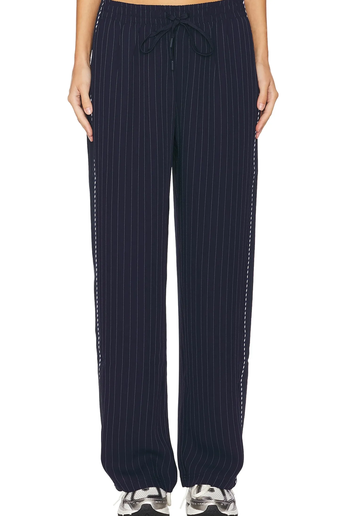 97% recycled polyester 3% viscose.Made in China.Machine wash.Pull-on styling with elastic waistband and drawstring.Side seam pockets.Crepe fabric.22" at the knee and narrows to 21" at the leg opening