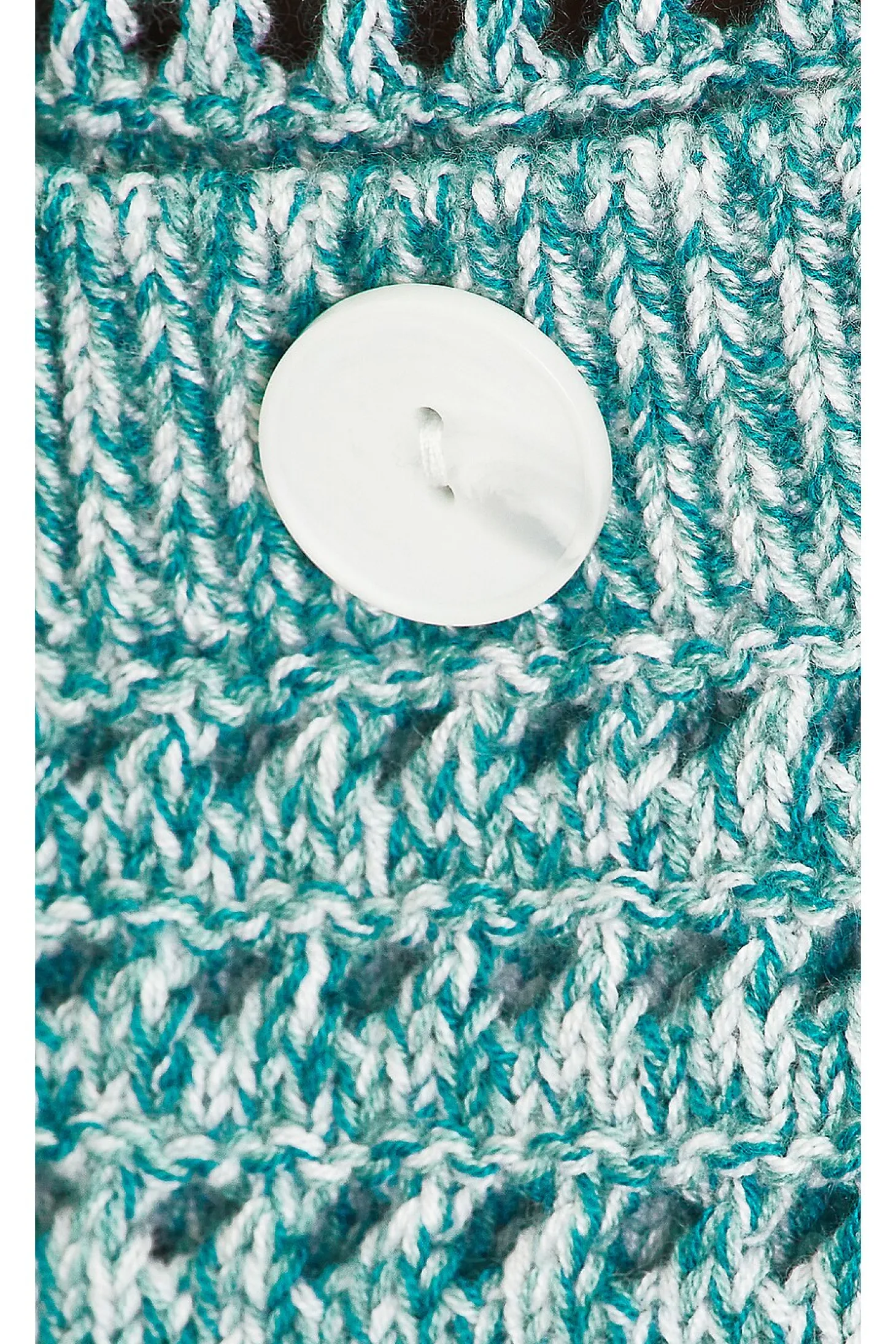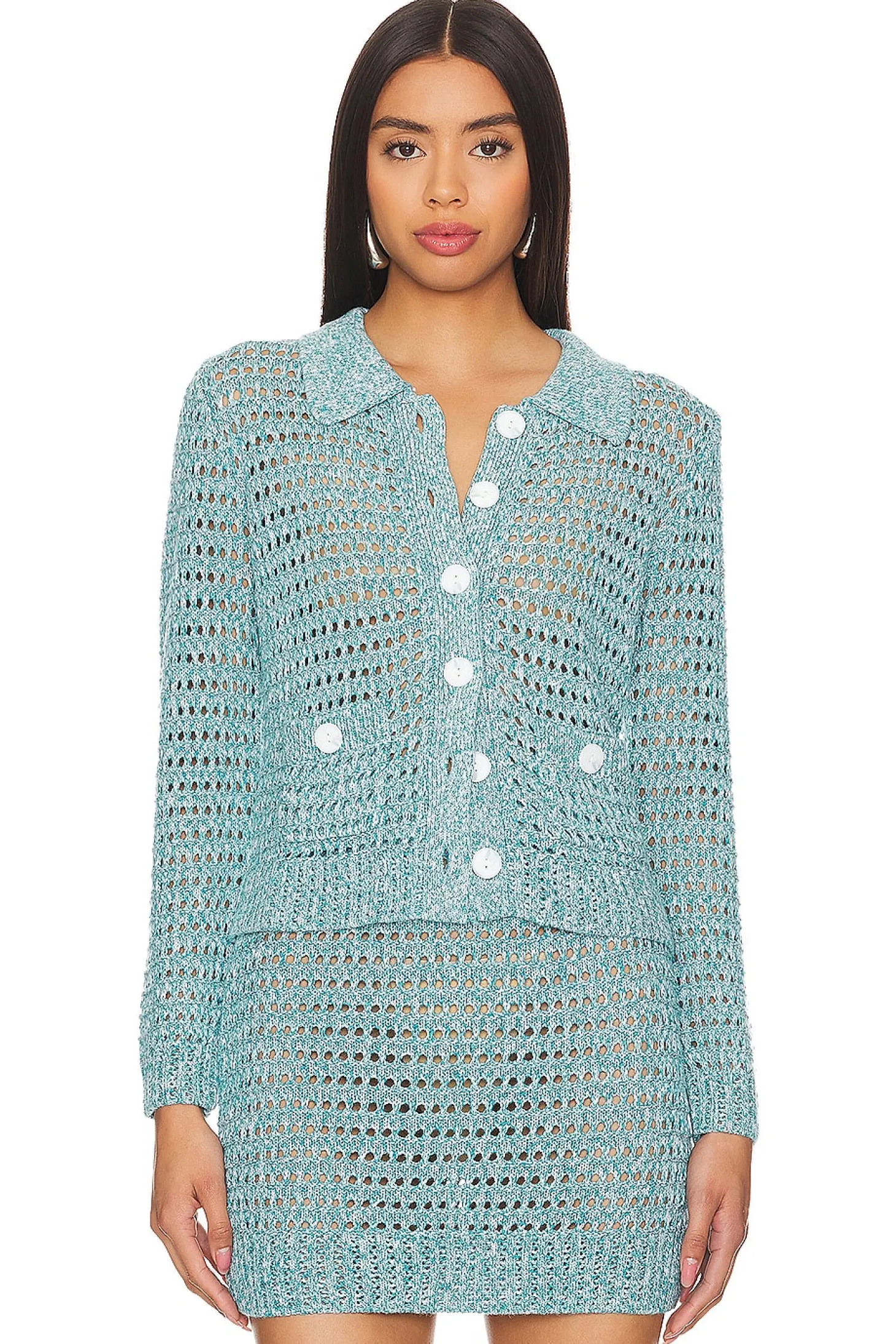 35% viscose 35% nylon 30% merino wool.Made in China.Hand wash.Front button closure.Faux front slip pockets with button detail.Open knit fabric.Item not sold as a set.Garment is intentionally sheer, undergarments will show through. Please note undergarment not included