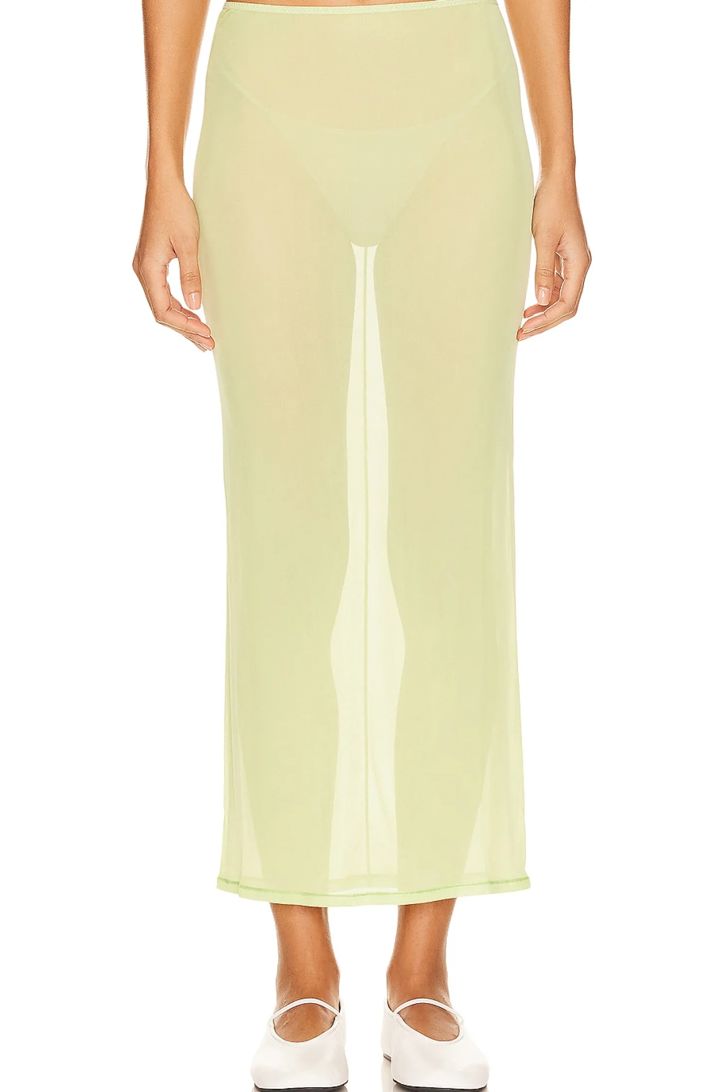 Can you say 'sheer summer stunner'? Dance all night in the GRLFRND Mesh Midi Skirt in Electric Lime. Crafted from sheer mesh fabric, this statement piece radiates festival-ready energy with its subtle neon hue. Electrify your wardrobe with this GRLFRND go-to today!.100% viscose.Made in China.Dry clean only.Unlined.Pull-on styling.Item not sold as a set.Garment is intentionally sheer, undergarments will show through. Please note undergarment not included