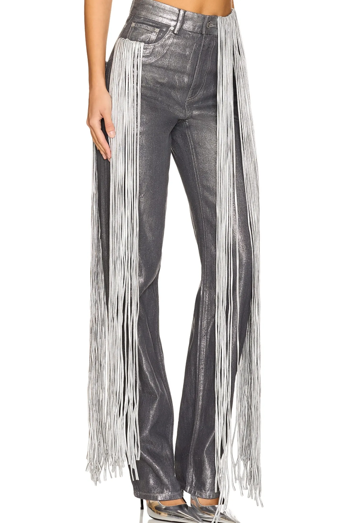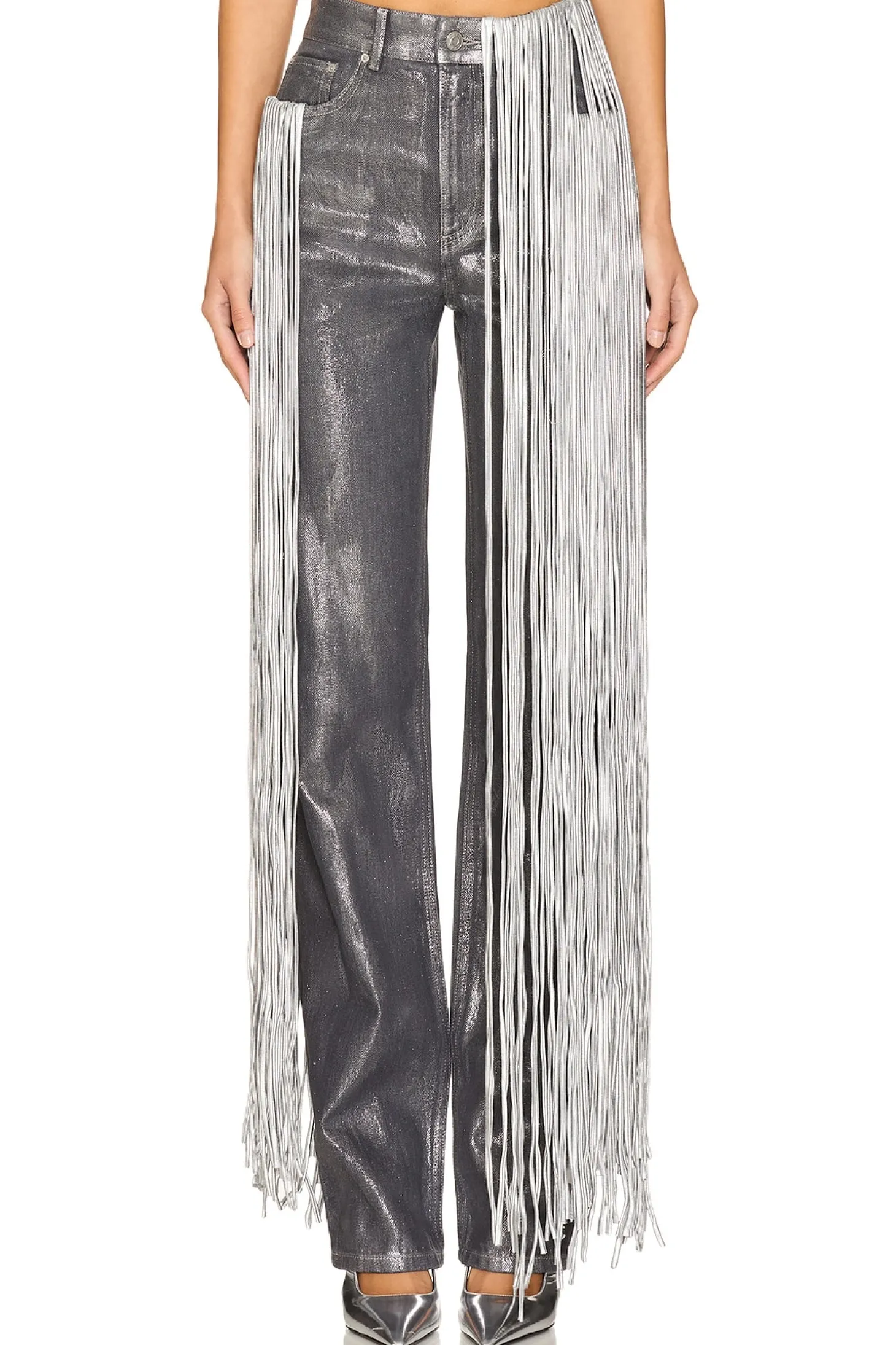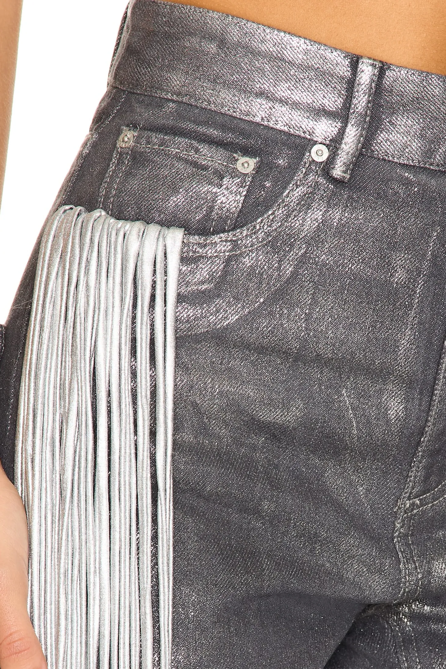 Self: 100% cotton Contrast Fabric: 93% cotton 7% elastane.Made in China.Hand wash.Zip fly with button closure.5-pocket design.Coated denim with metallic fringe.18" at the knee narrows to 14" at the leg opening