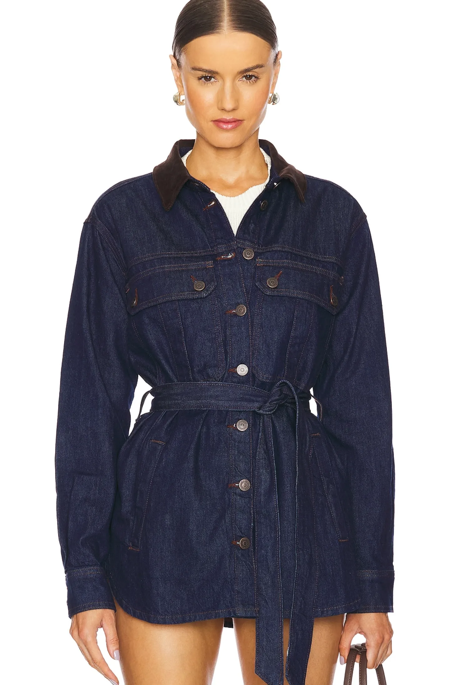 100% cotton.Made in USA.Machine wash.Button down closure.Slant pocket styling Dual buttoned breast pockets.Detachable waist-tie.Corduroy fabric at collar