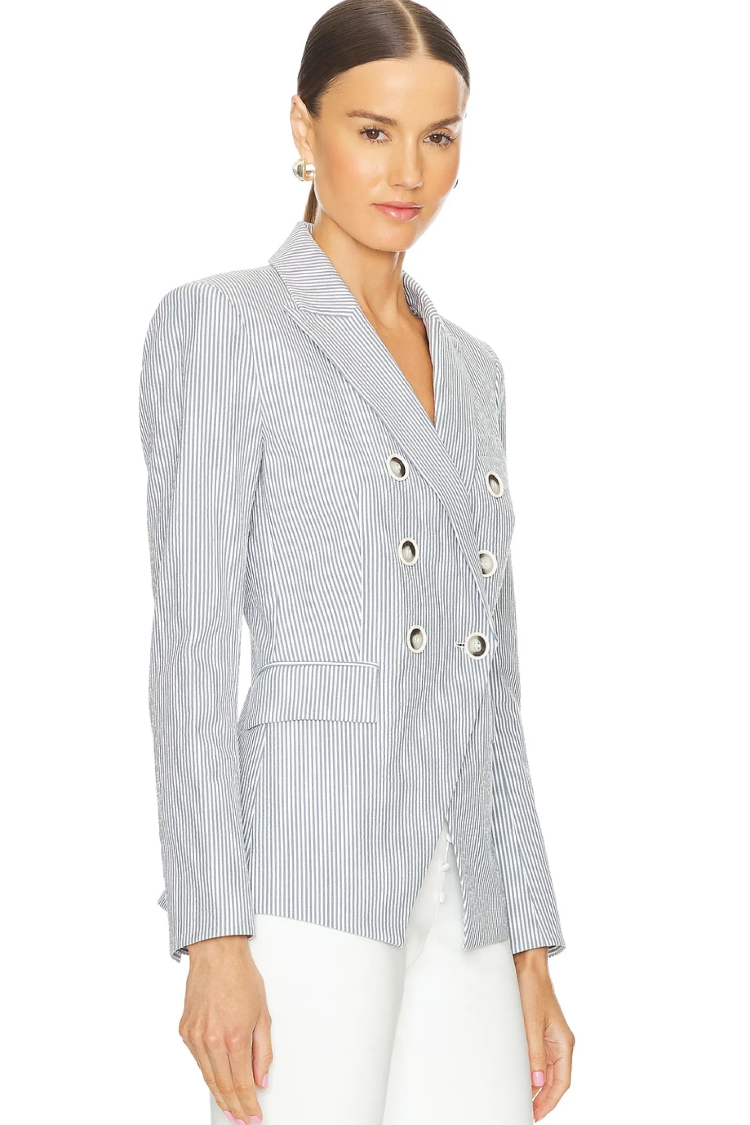 Self: 98% cotton 2% elastane Lining: 96% polyester 4% elastane.Made in USA.Dry clean only.Dual-breasted front button closure.Padded shoulders.Side flap pockets Button cuffs.Twill fabric