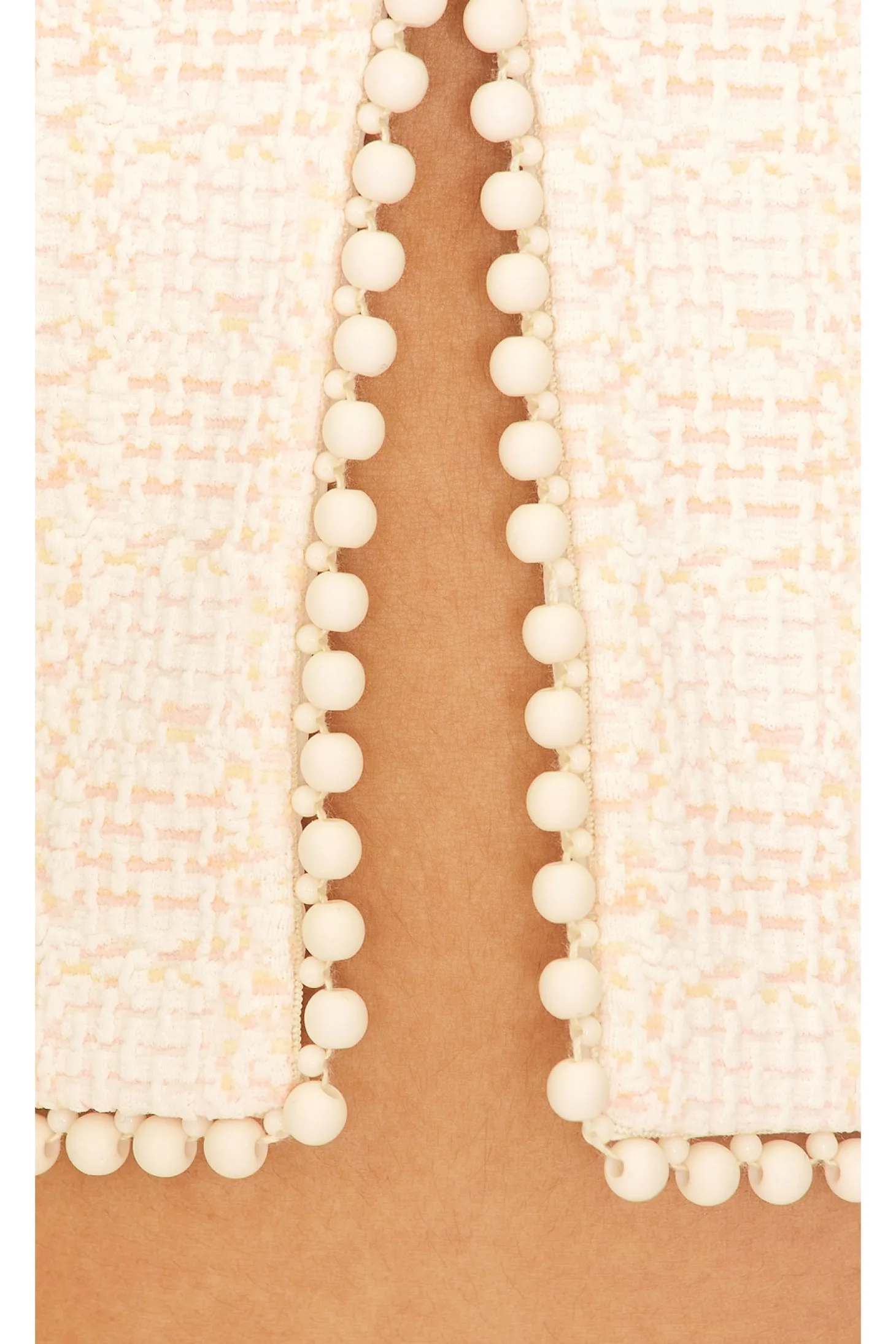 Self: 65% polyamide 25% polyester 10% elastane Lining: 88% nylon 12% elastane.Made in China.Hand wash.Front hook and eye closure.Acrylic bead embellished trim.Lightweight fabric.Item not sold as a set