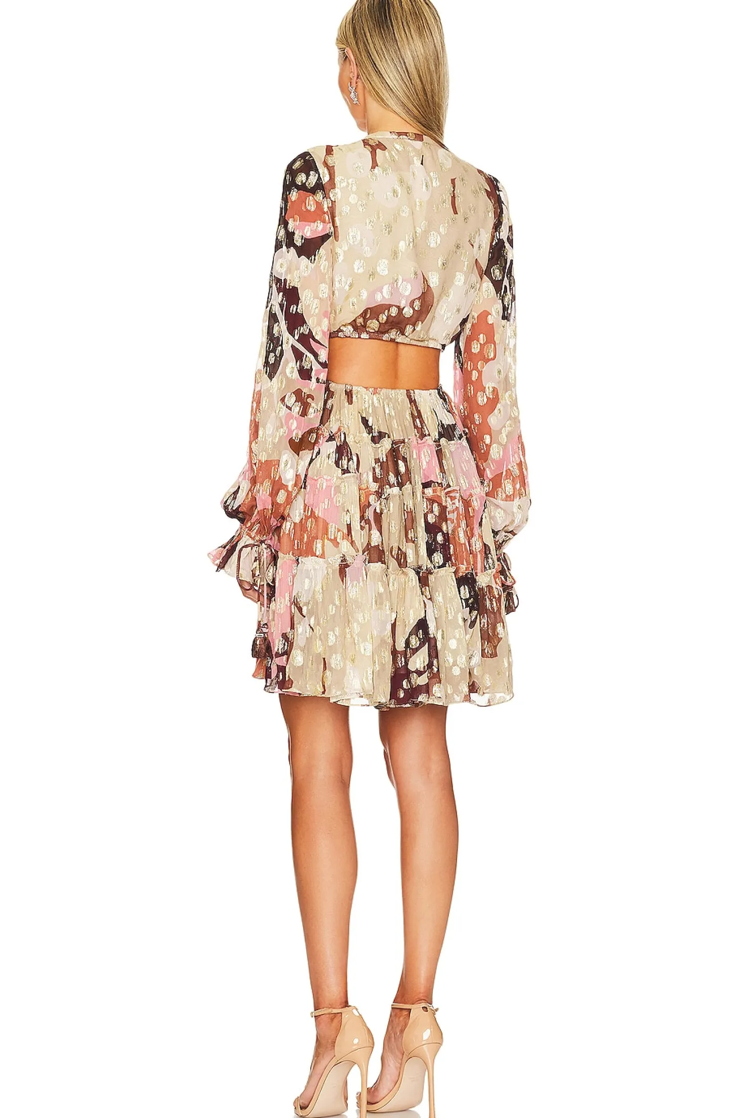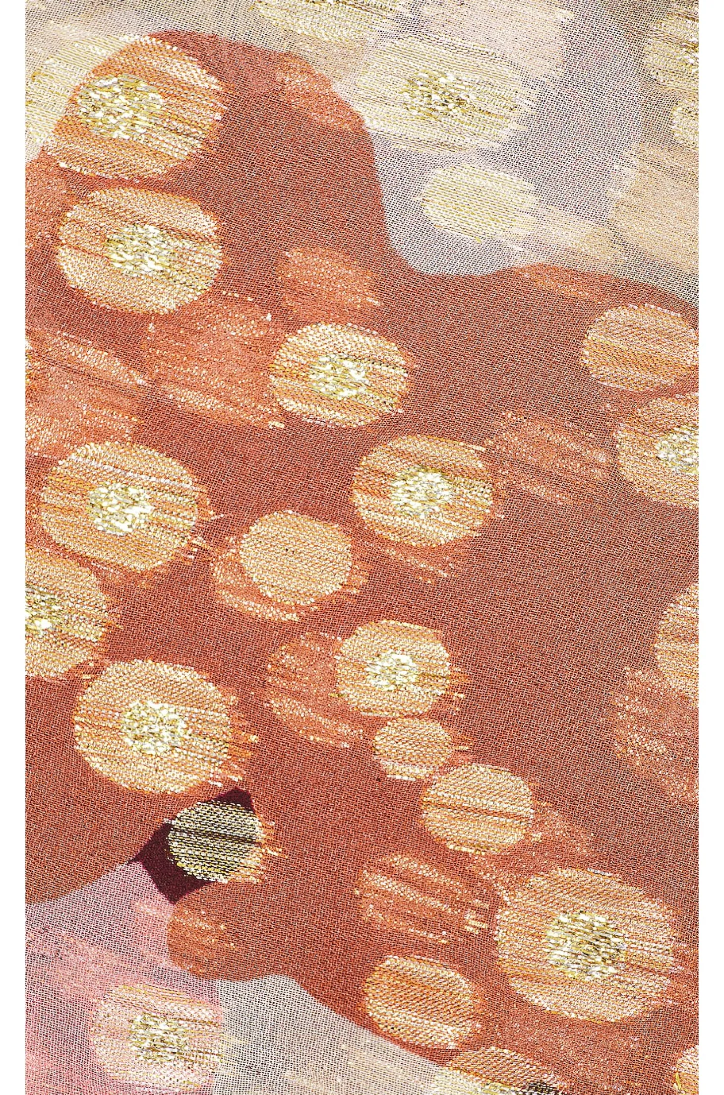 Self: 88% viscose 12% metallized fabric Lining: 100% viscose.Made in India.Dry clean.Fully lined.Front button closure with elastic waistband Side and back cut-outs.Ruffled cinched cuffs with tie detail.Ruffled skirt Metallic threading throughout