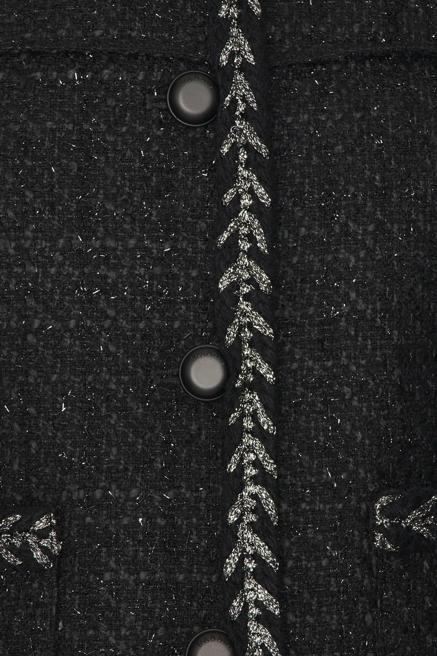Self: 69% polyester 31% wool Lining: 51% viscose 49% polyester.Made in Vietnam.Dry clean only.Front button closure.Tweed fabric with metallic threading and padded shoulders