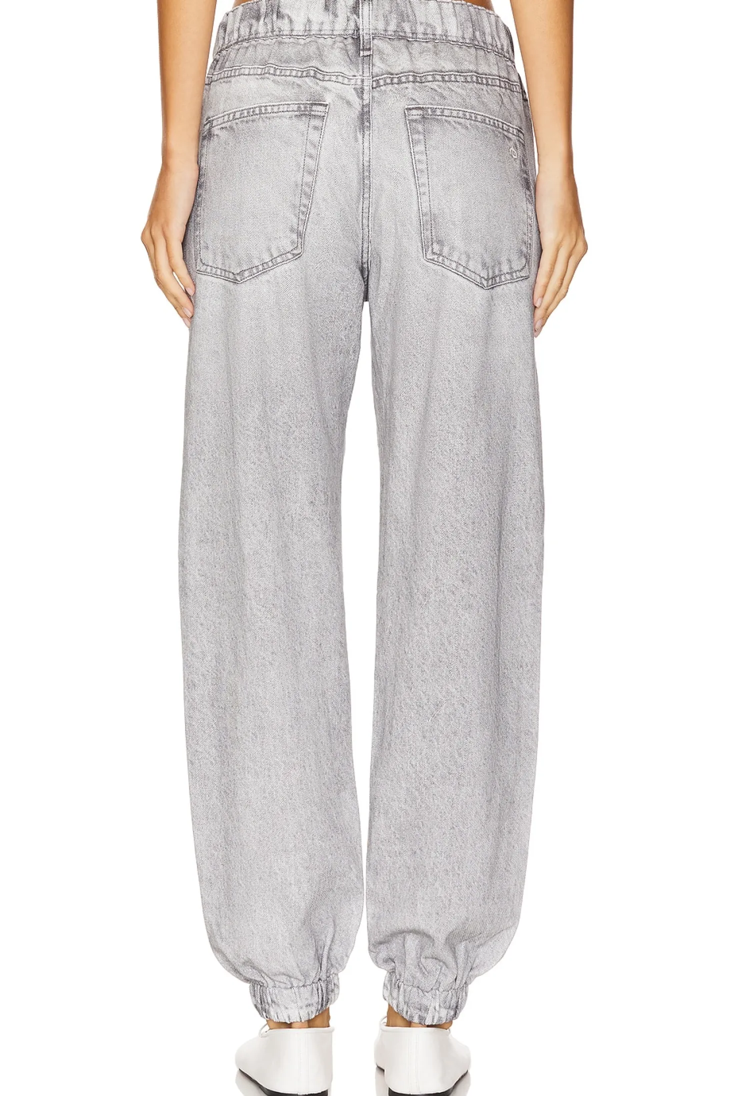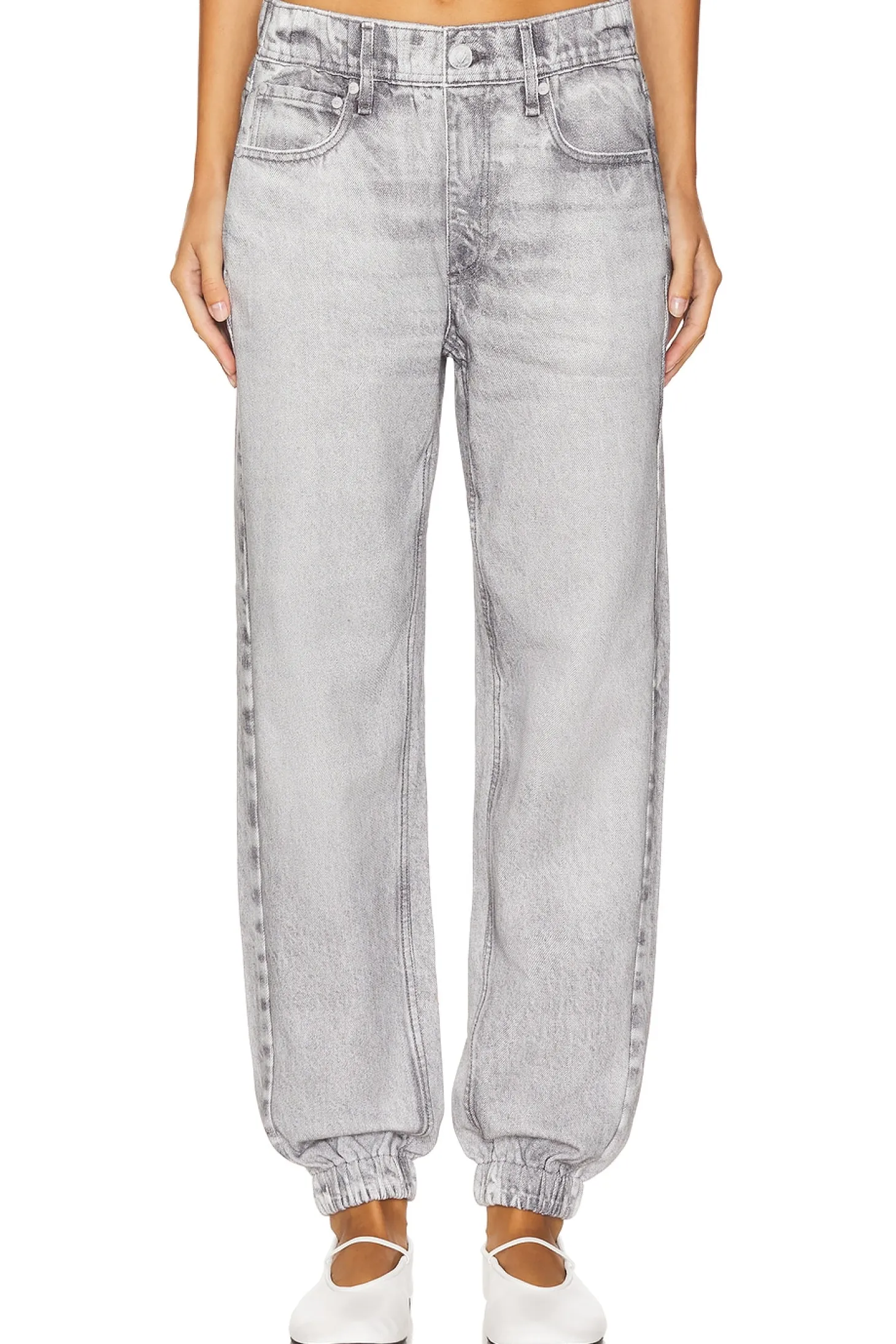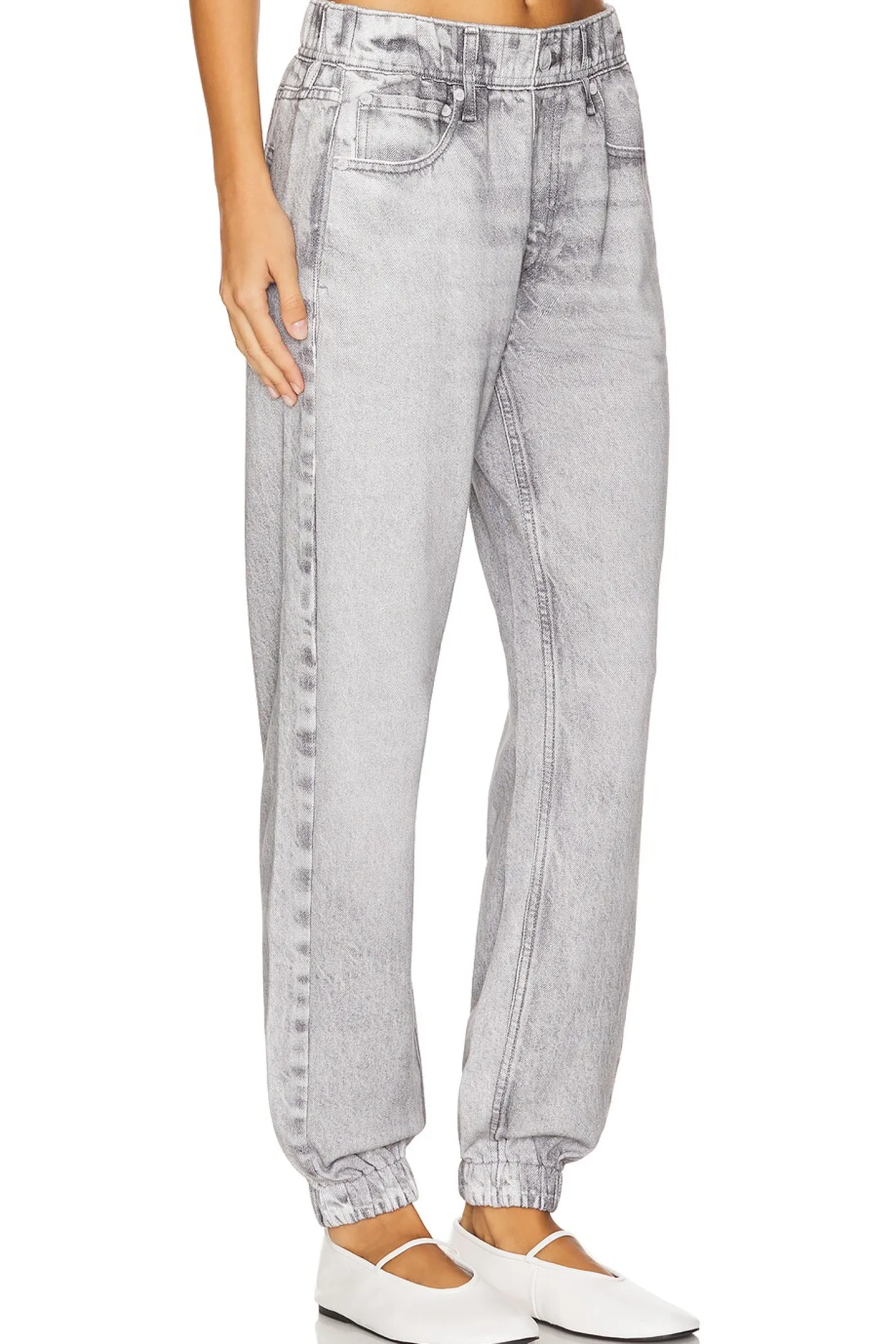 Self: 100% cotton Pocketing: 100% cotton.Made in China.Machine wash.Pull-on styling with elastic waistband.Side seam pockets.Elastic cuffs.Terrycloth fabric with denim print detail.19" at the knee narrows to 11" at the leg opening