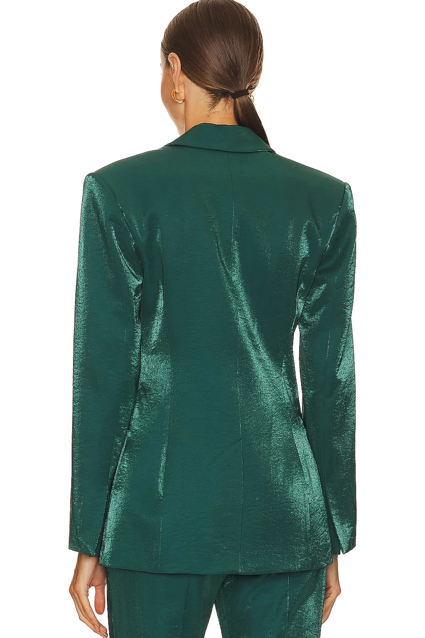 Polyester blend.Made in China.Dry clean recommended.Singular front button closure.Padded shoulders.Breast and side welt pockets.Satin fabric Item not sold as set