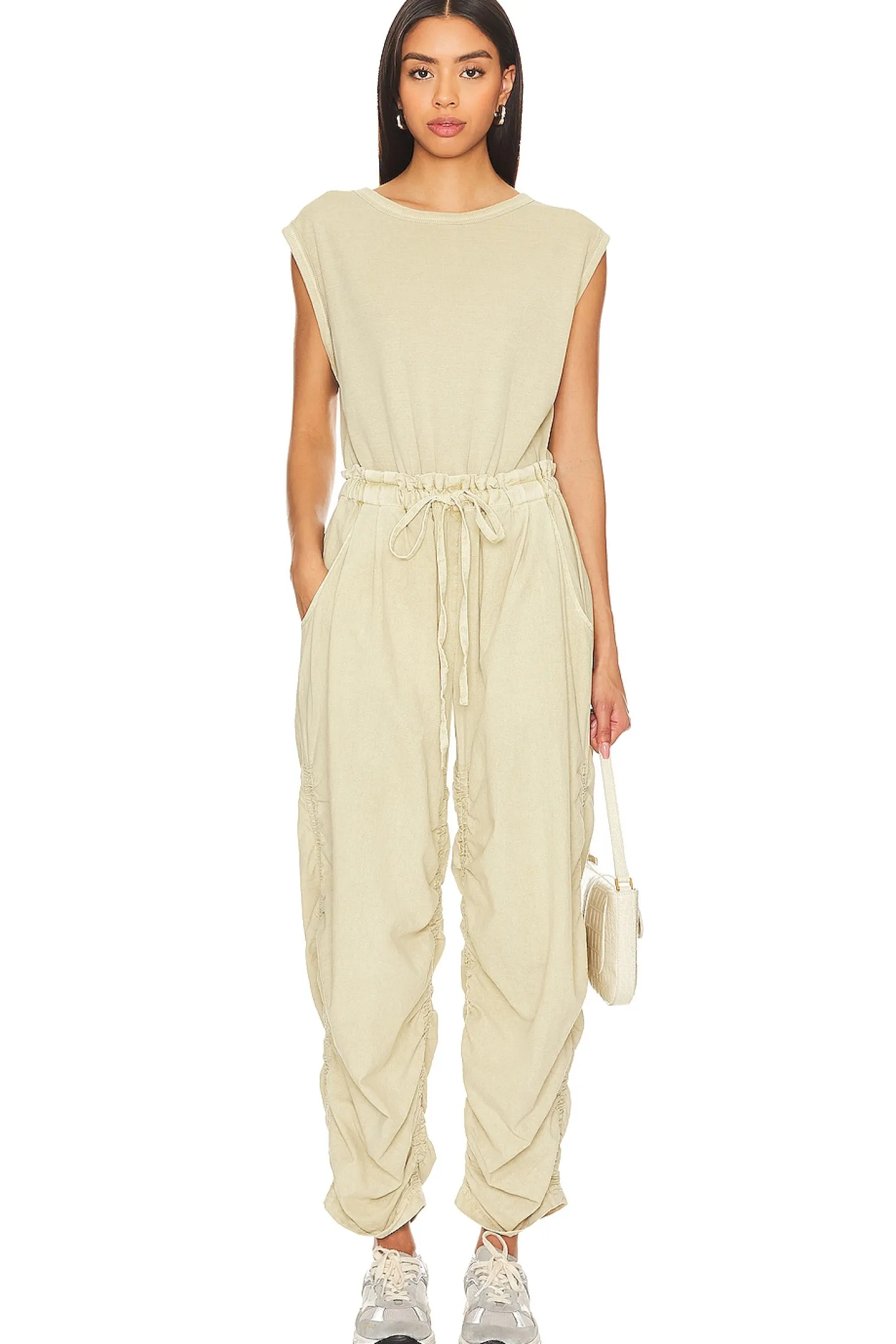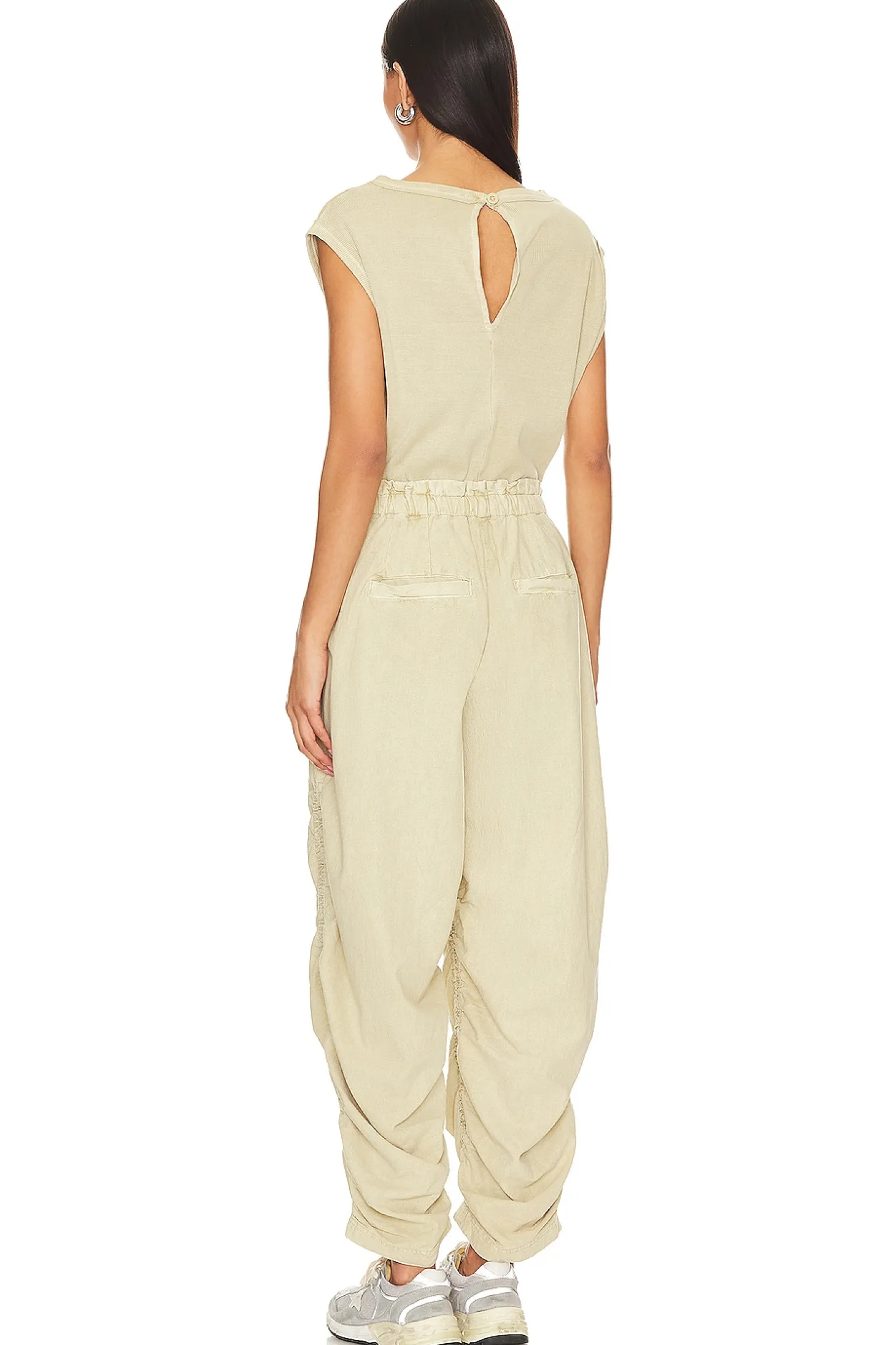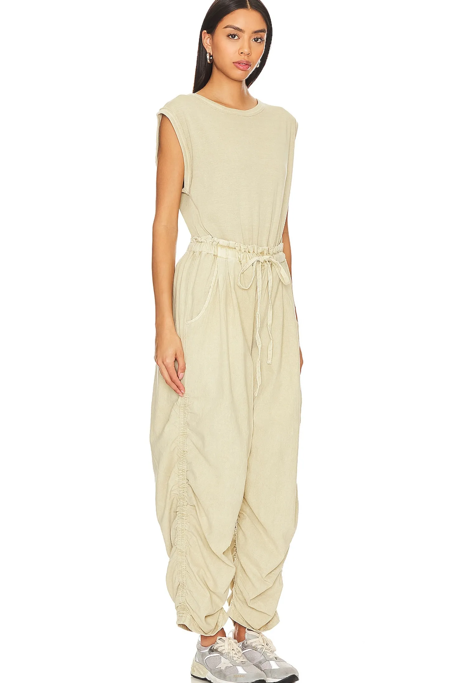 Embrace effortless style with the Free People Mixed Media One Piece in Sand Jam. This one-piece is not just an outfit; it's the epitome of cozy-chic fashion. This versatile one-piece offers endless ways to wear it – easily elevate it with a pair low kitten heels for a chic look or keeping it laid-back with sporty sneakers..Self 1: 94% cotton 6% spandex Self 2: 100% cotton.Made in India.Machine wash.Pull-on styling and back keyhole with loop button closure Drawstring waistband.Side slant and back slip pockets.Ribbed jersey fabric bodice and crepe bottoms with ruched side panels