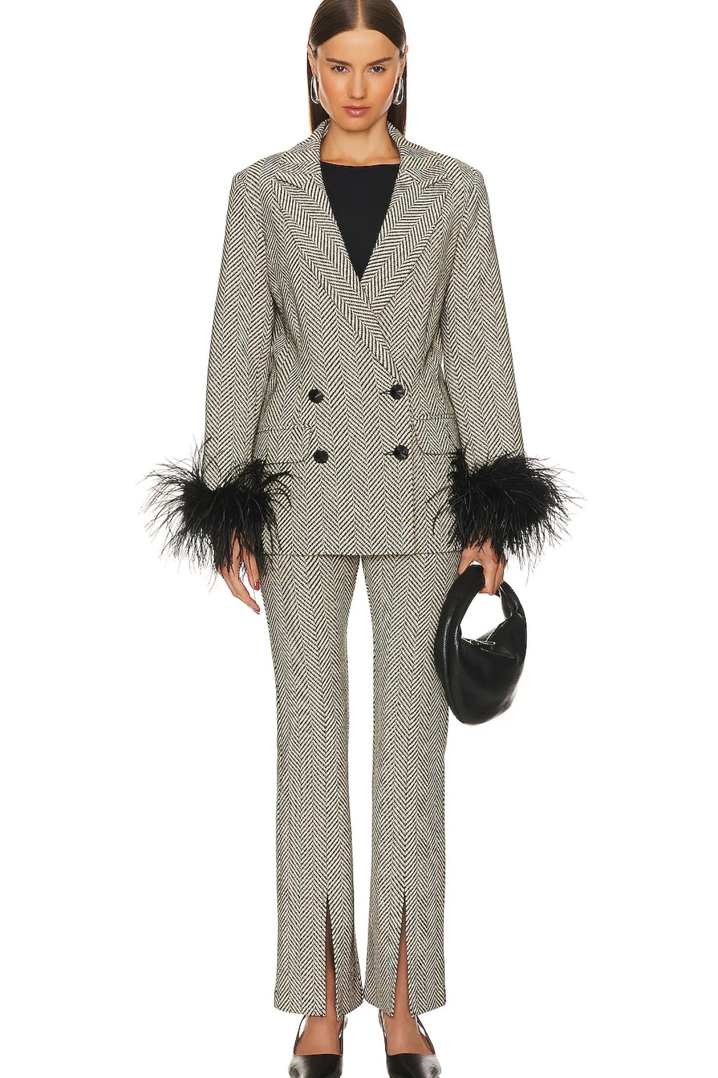 Self: 45% cotton 19% wool 18% acrylic 11% nylon 7% metallic Lining: 100% polyester.Made in USA.Dry clean only.Hidden back zipper closure.Split cuffs.Tweed fabric with metallic threading throughout.Item not sold as a set.16" at the knee breaks to 18" at the leg opening