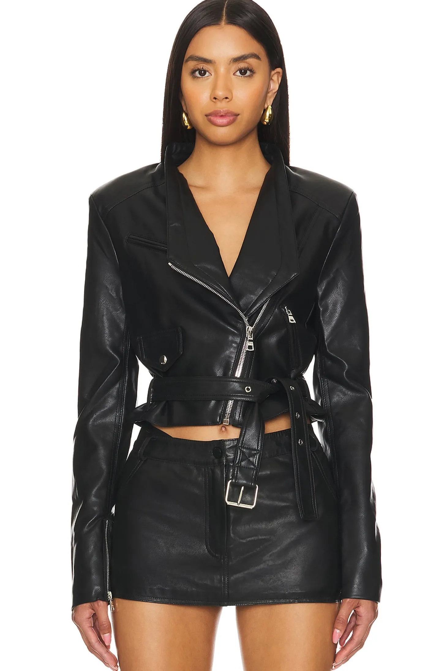 Self: 55% polyester 45% polyurethane Lining: 100% polyester.Made in China.Dry clean only.Front asymmetrical zipper closure.3-pocket design.Attached belt at hem.Midweight faux leather fabric